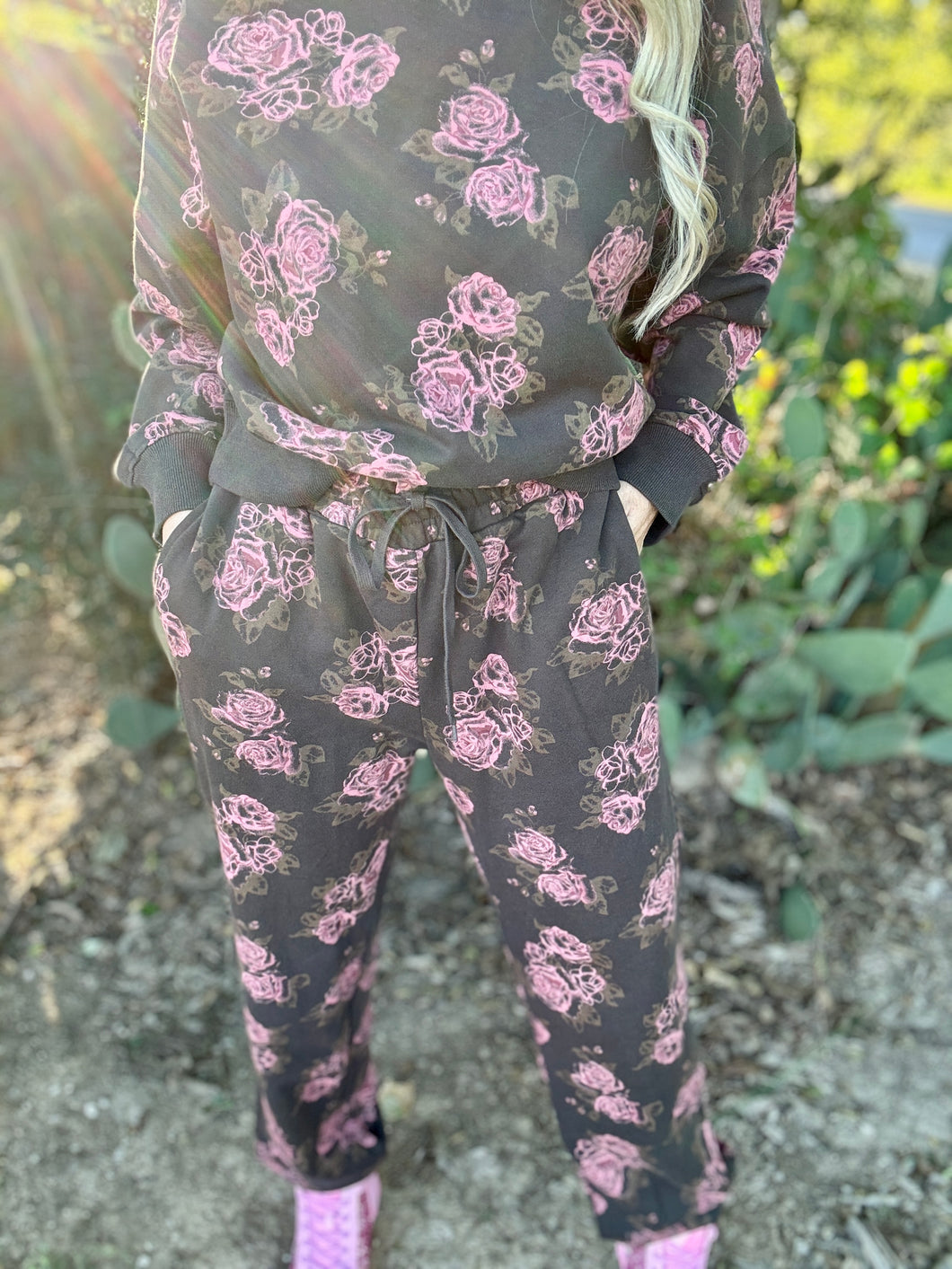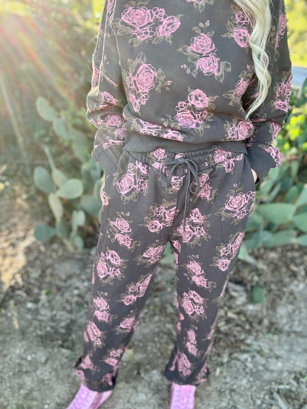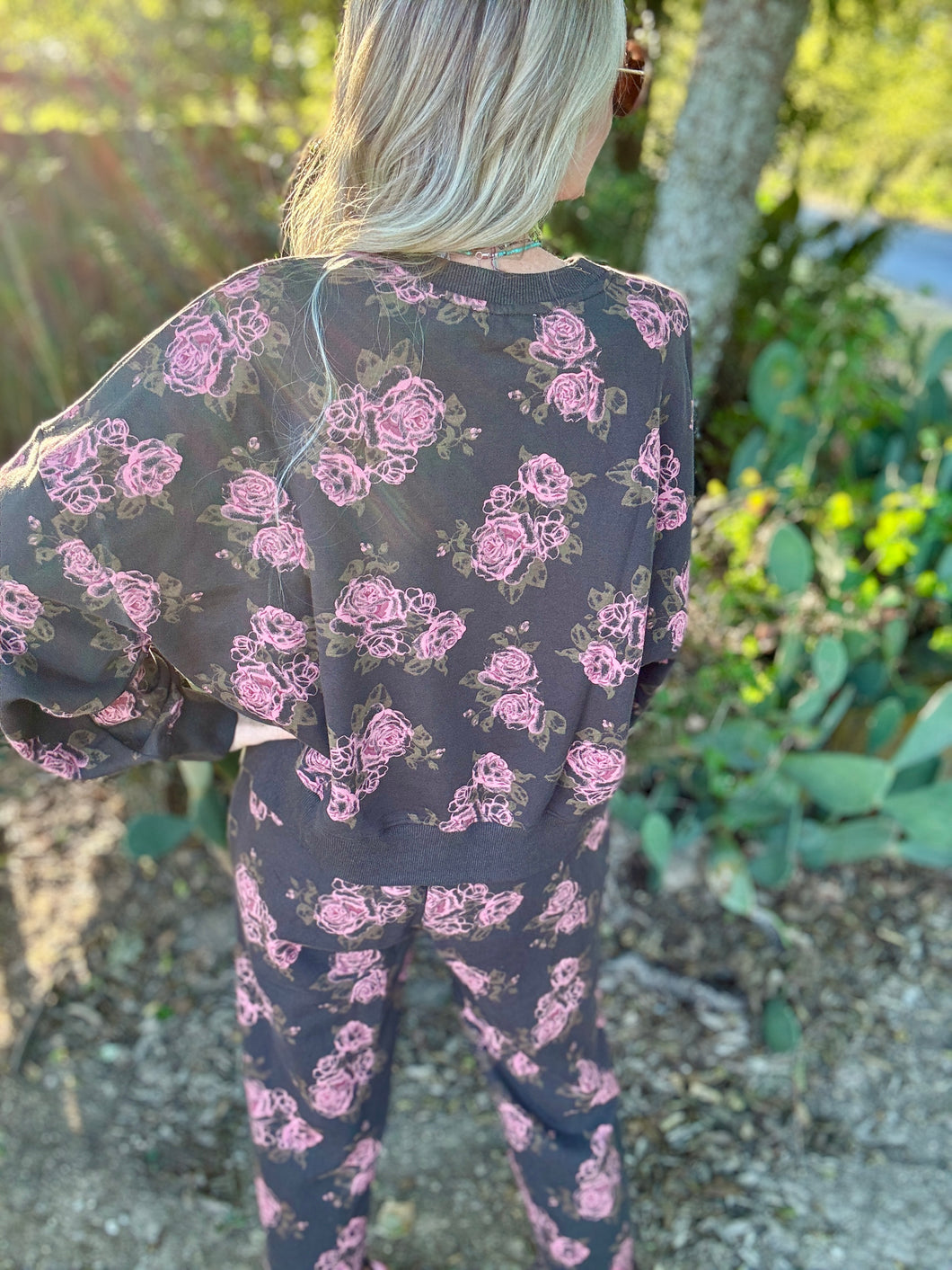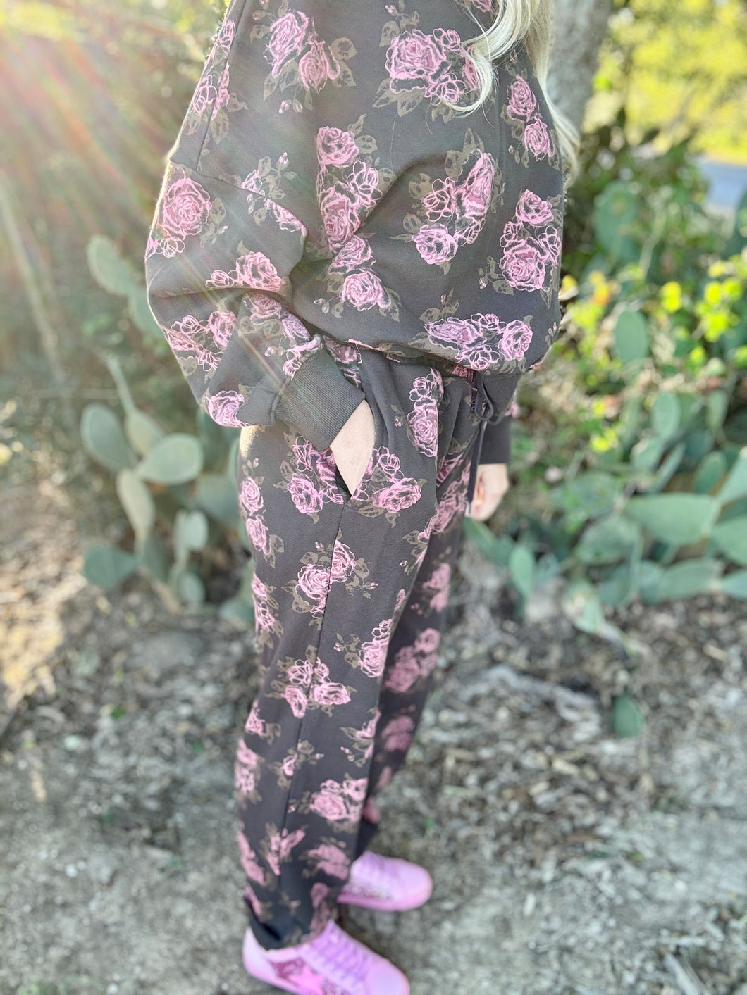 Get cozy and stylish with The Charcoal Rose Set, featuring an oversized fit crafted from lightweight French terry material. Its washed antique look gives it a unique vintage vibe, perfect for lounging or casual outings. This matching jogger set combines comfort and playful charm effortlessly. These run more on the roomy side