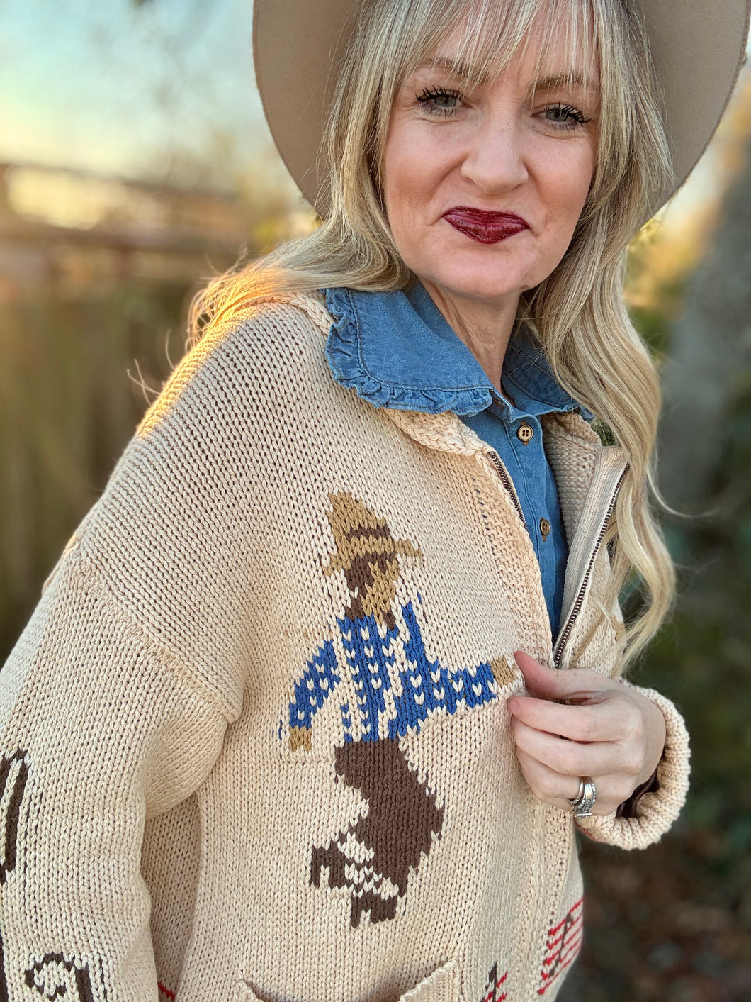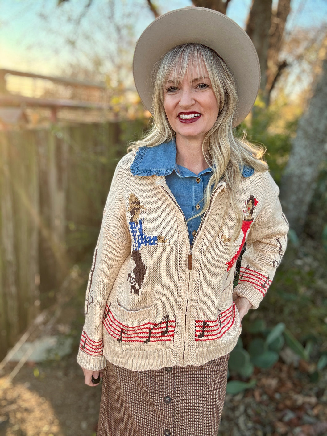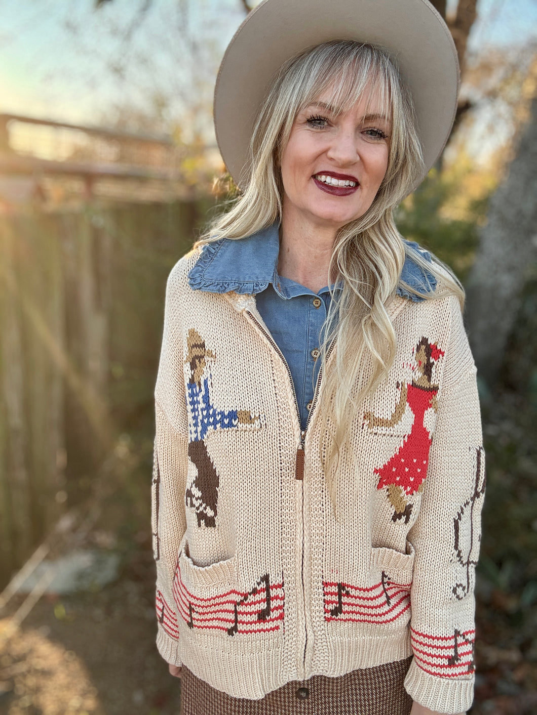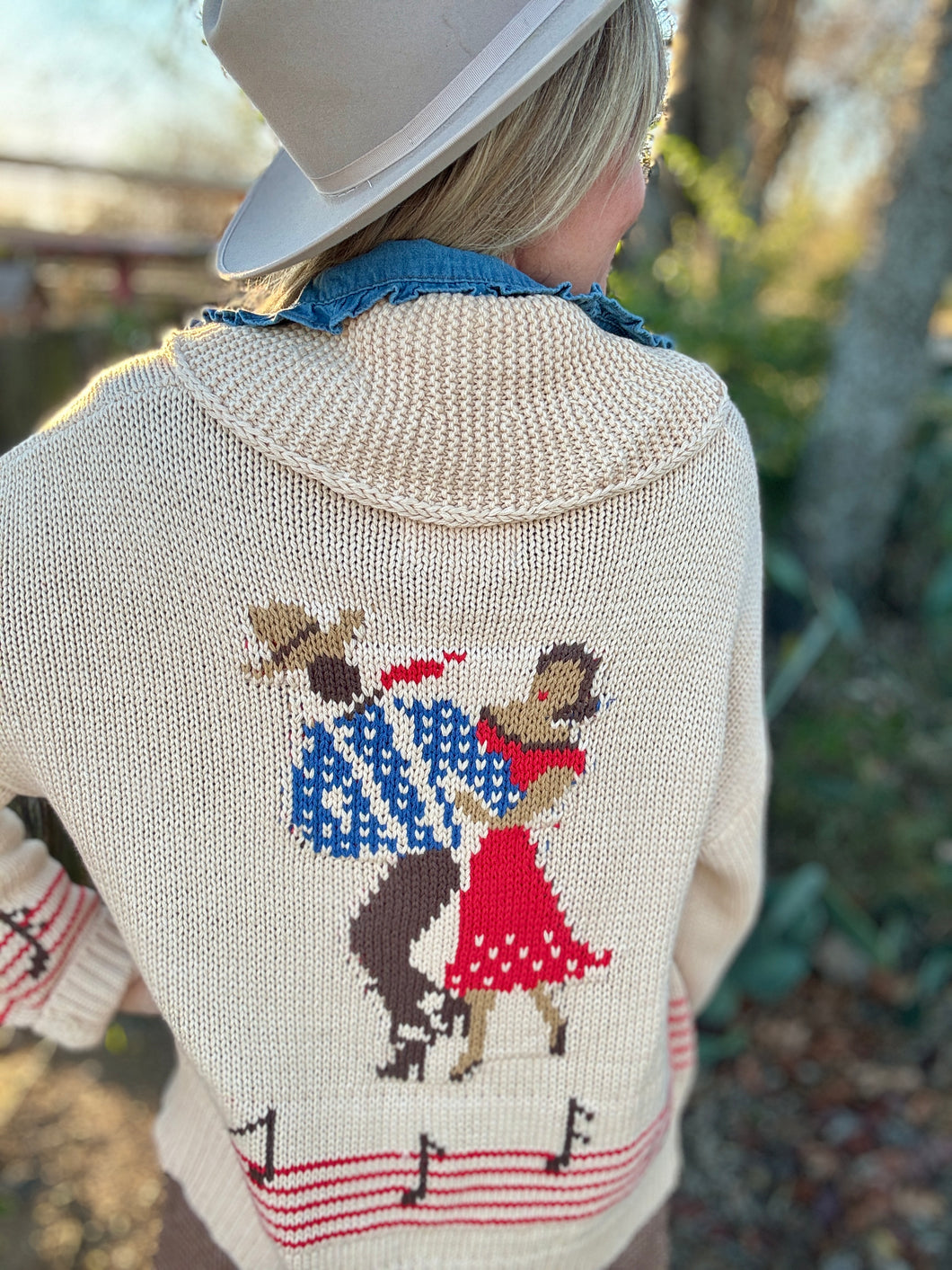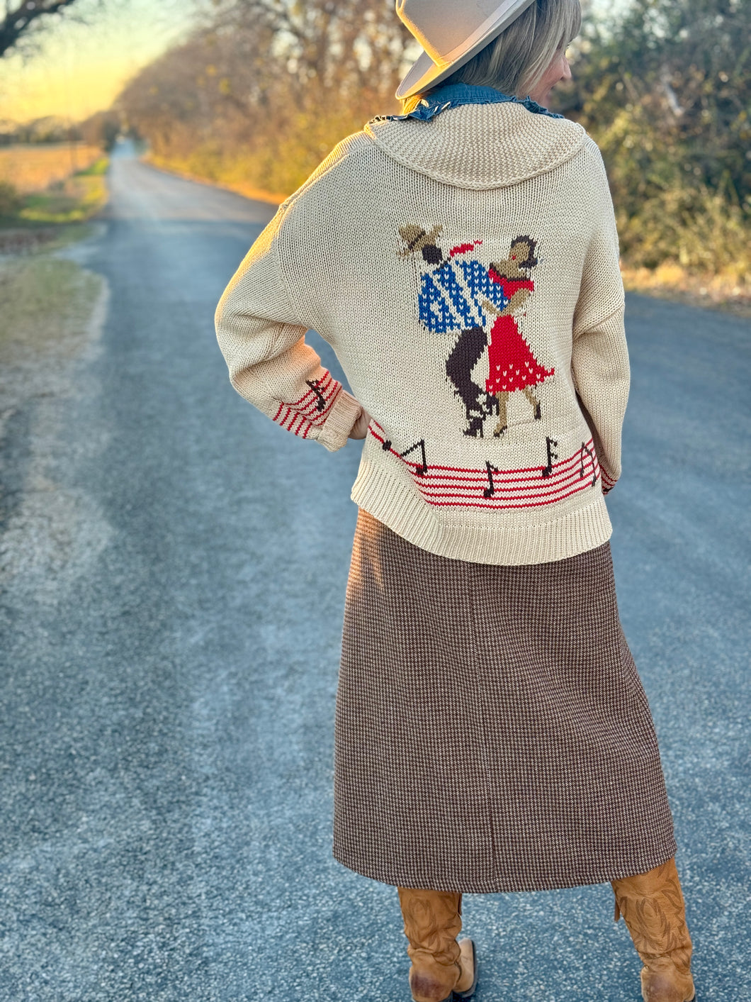 Slip into the Do-si-do cardigan and let your love for country music shine! This oversized, relaxed boyfriend-fit sweater features charming western dancers and musical notes that celebrate the spirit of the dance floor. Perfect for layering over your favorite tee or wearing solo, it's the ideal piece for anyone who lives and breathes country vibes. Cozy, stylish, and unapologetically fun—your new go-to for casual days and honky-tonk nights.
