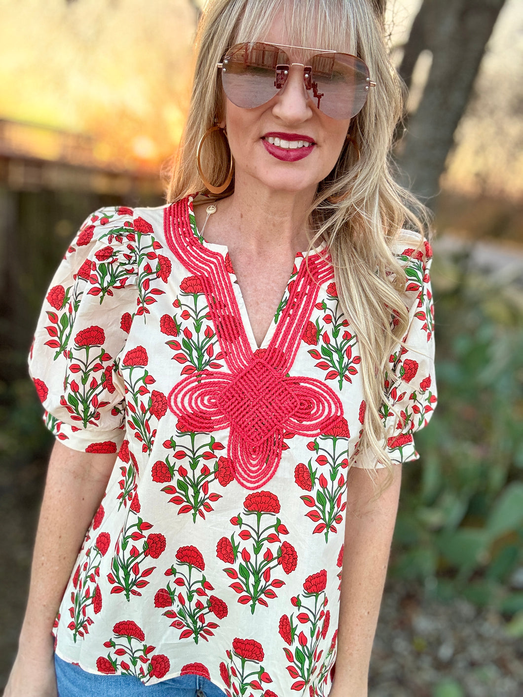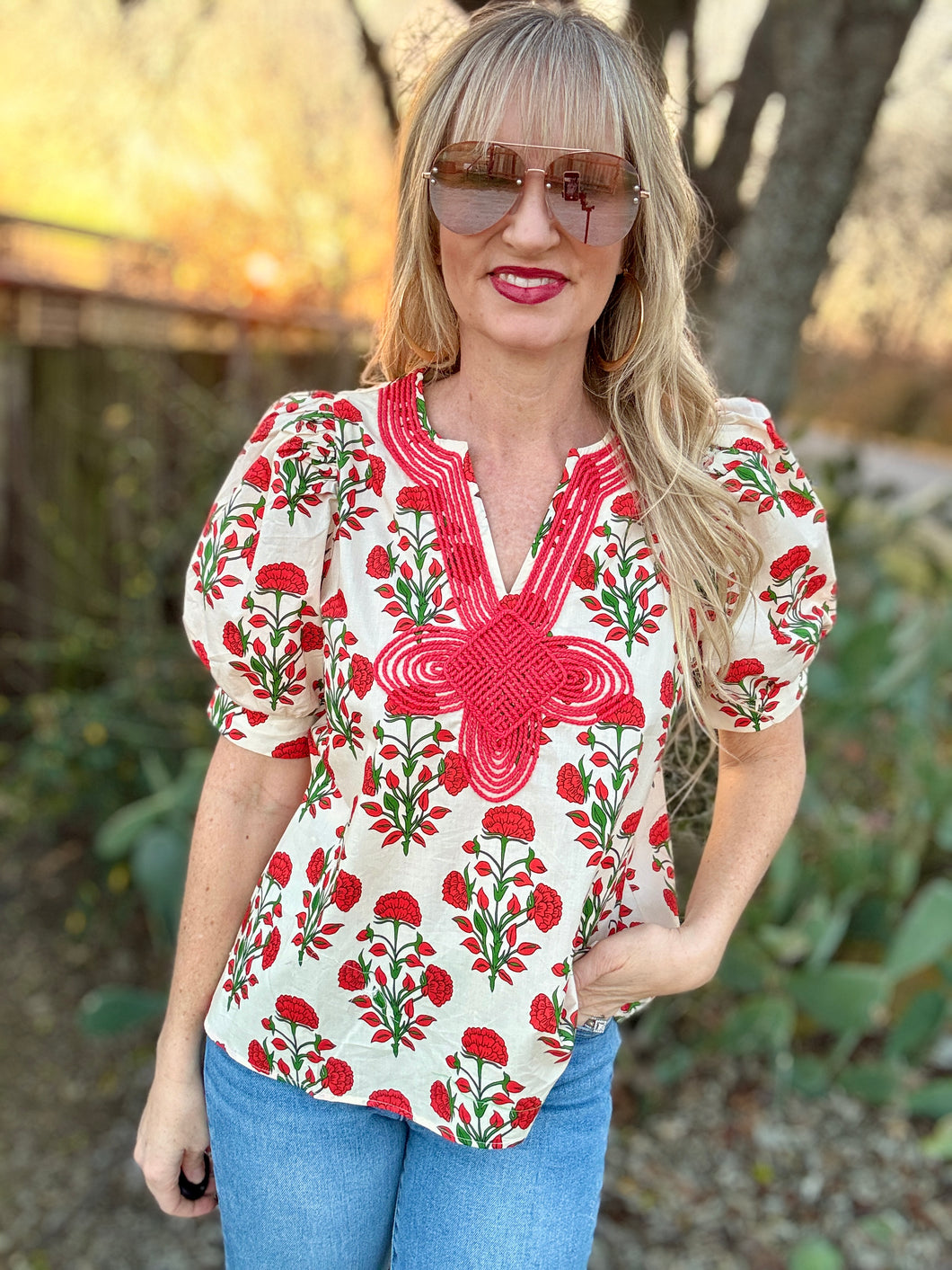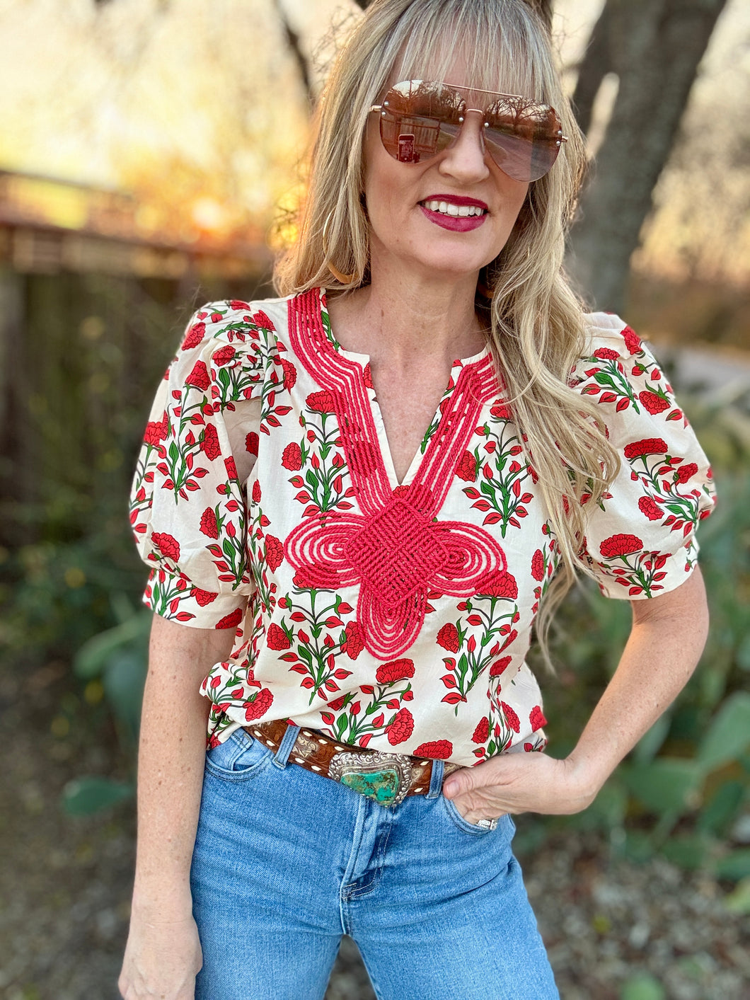 Elevate your spring wardrobe with The Durango Marigold Blouse! Adorned with a stunning floral print, it captures the essence of the season. The unique thread detailing on the bib adds a touch of artistry, making this blouse a true standout. Embrace effortless elegance and feel the vibrant energy it brings!