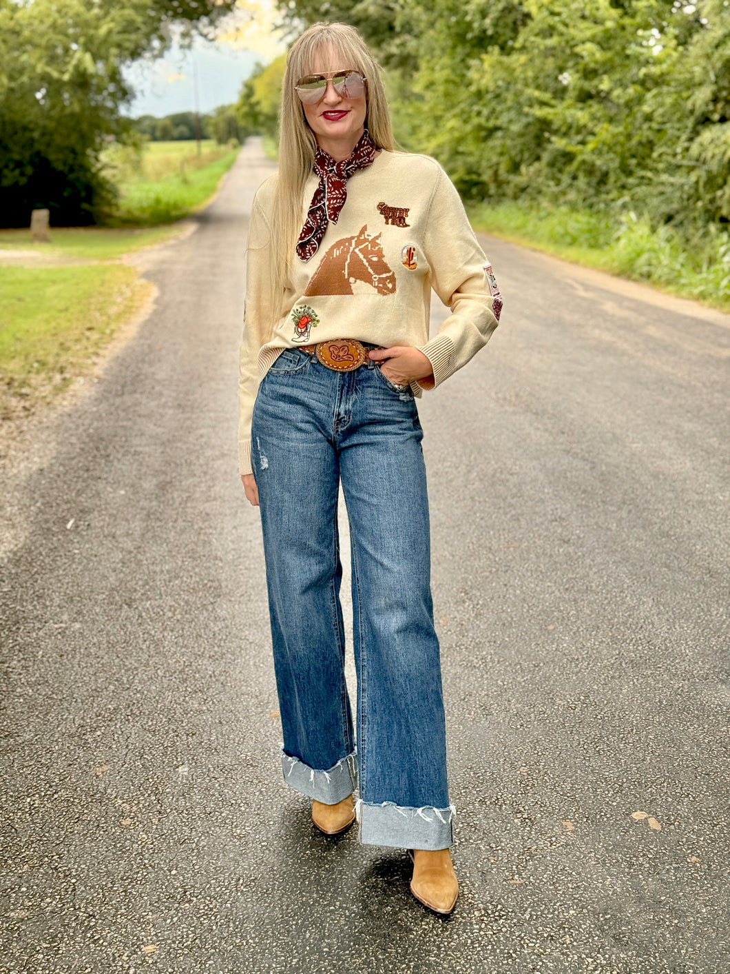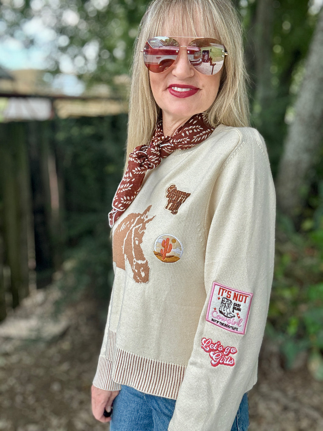 The Pony Patch Sweater is your new favorite fun and cozy layer! Super soft and lightweight, it offers comfort without the bulk. Featuring playful western patches on the front, back, and arms, this horse sweater brings a bit of wild spirit to your everyday style. Perfect for casual days when you want to feel relaxed and charmingly unique.