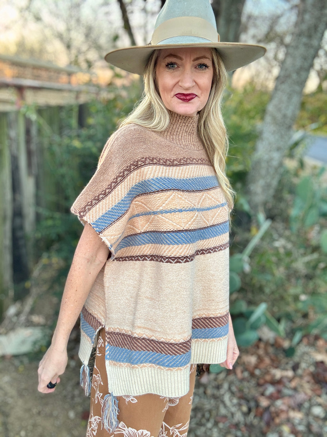Throw on effortless style with this charming poncho sweater! Featuring a cozy mock neck, relaxed fit, and short sleeves, it's perfect for layering or wearing solo. The playful tassels dancing along the split side hemline add just the right amount of flair. Whether you're channeling prairie vibes or just want comfort with character, this piece delivers both in spades.