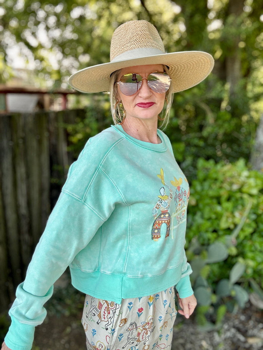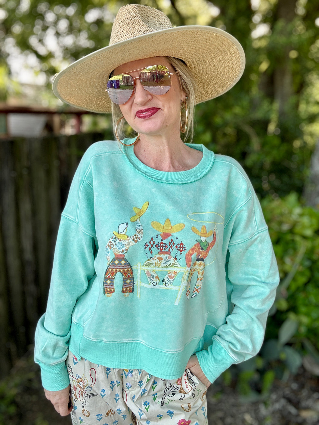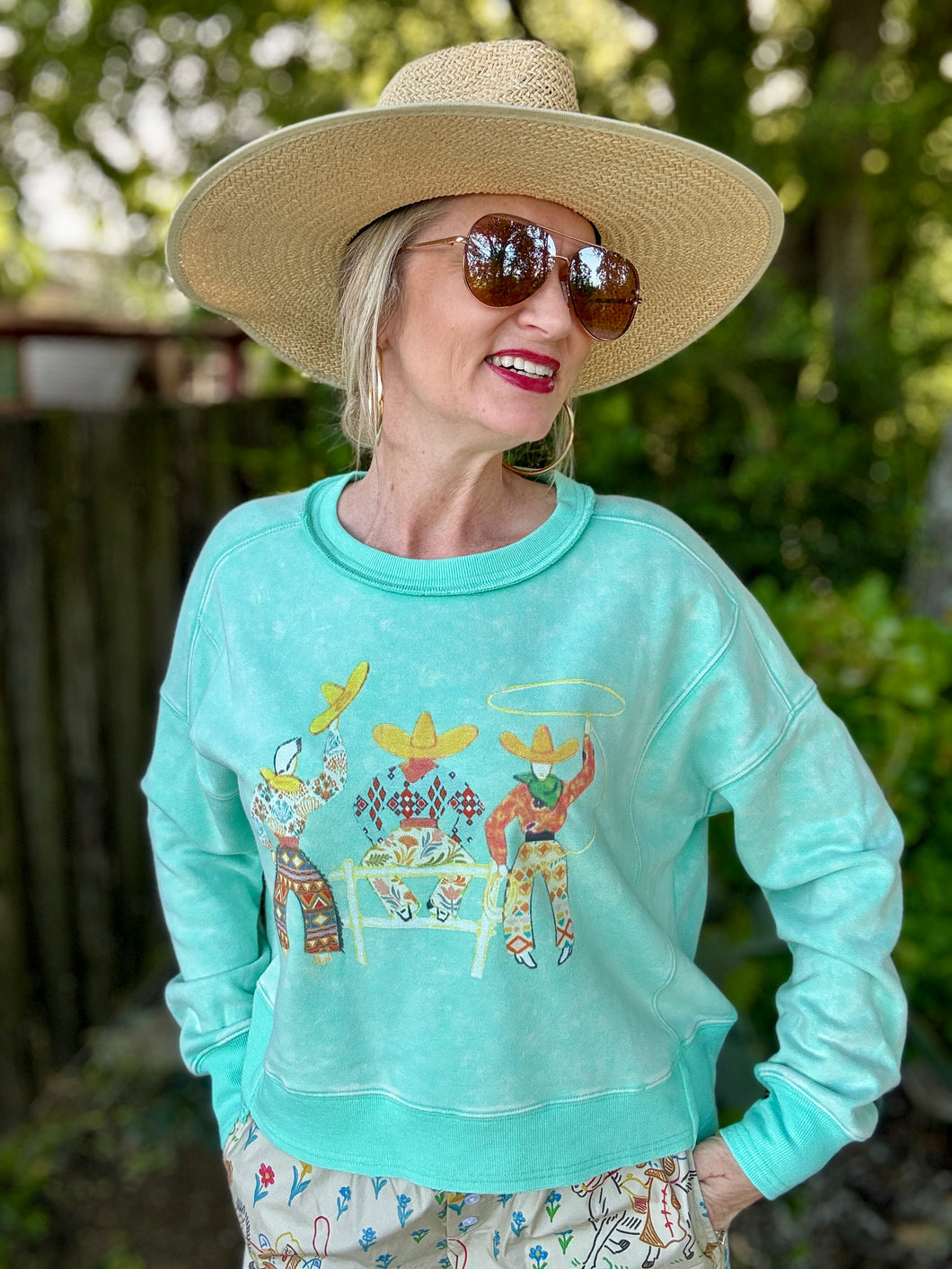 Meet your new wardrobe sidekick: The 3 Amigos sweatshirt! With its bright fun colors and a western twist, this super soft, long-crop gem will have you feeling as cozy as a cowboy in a cuddle fest. Perfect for wrangling style while keeping the chill at bay!