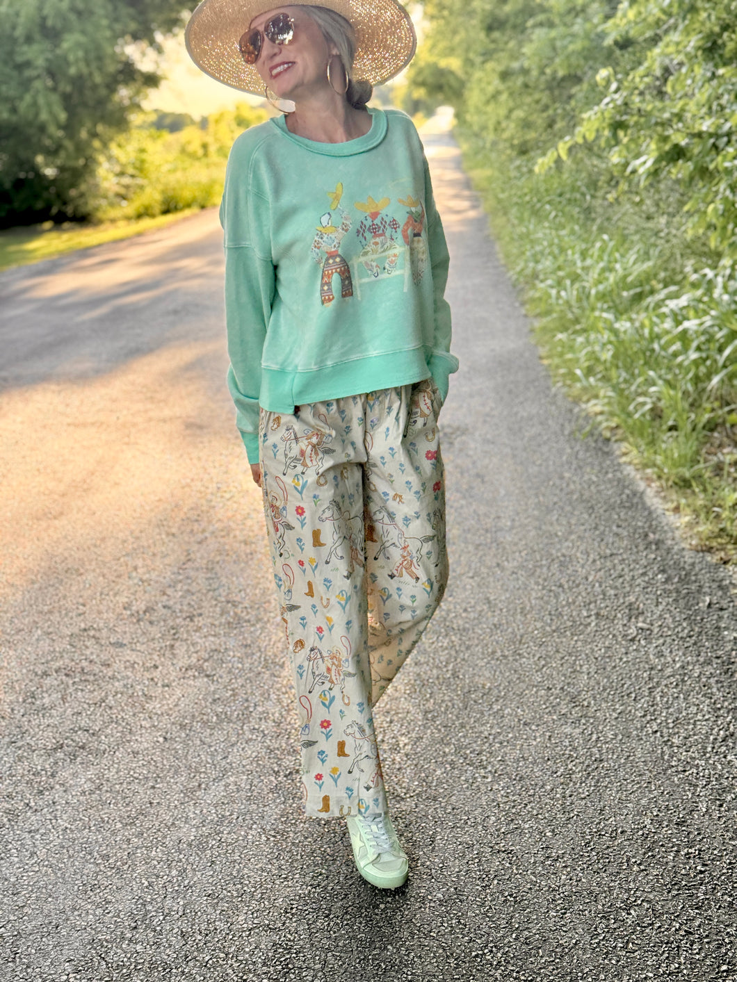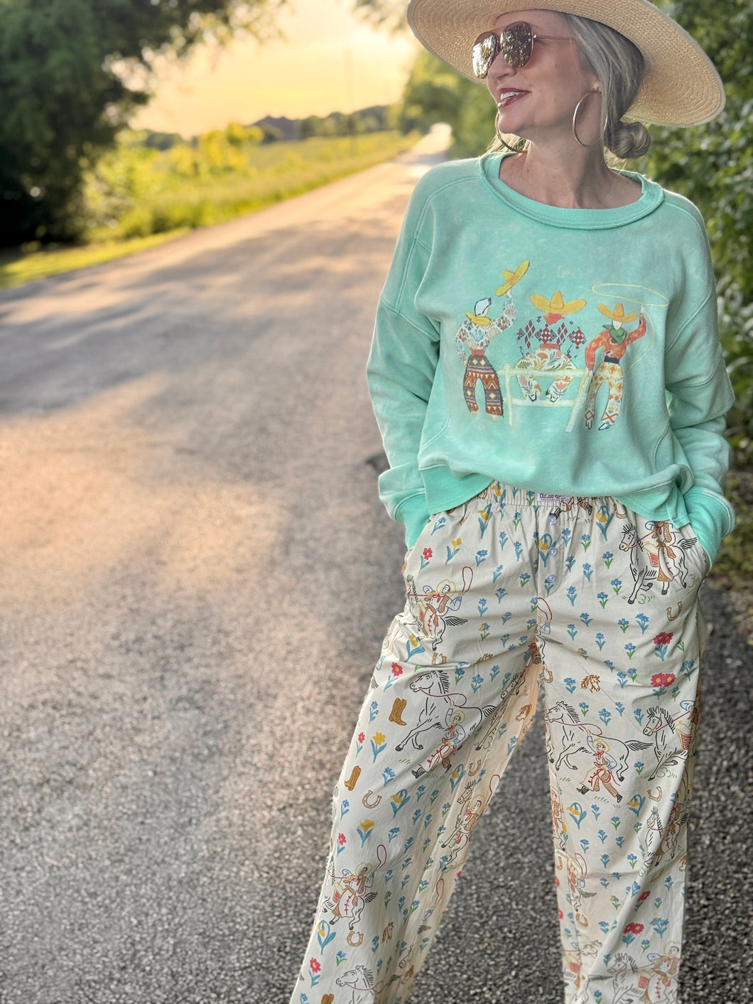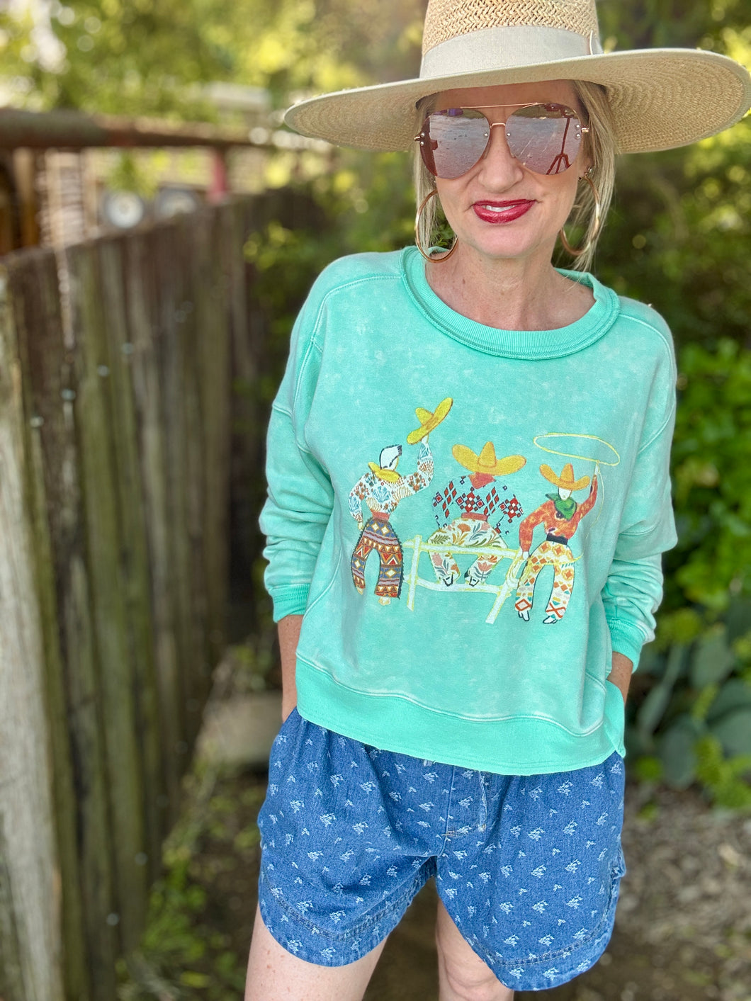 Meet your new wardrobe sidekick: The 3 Amigos sweatshirt! With its bright fun colors and a western twist, this super soft, long-crop gem will have you feeling as cozy as a cowboy in a cuddle fest. Perfect for wrangling style while keeping the chill at bay!