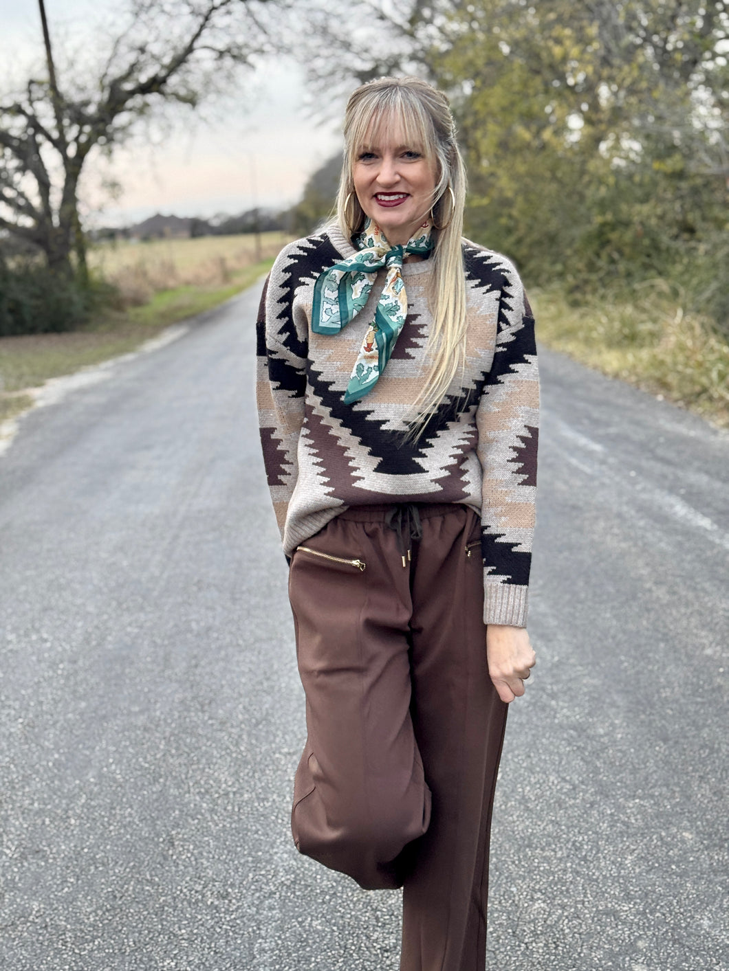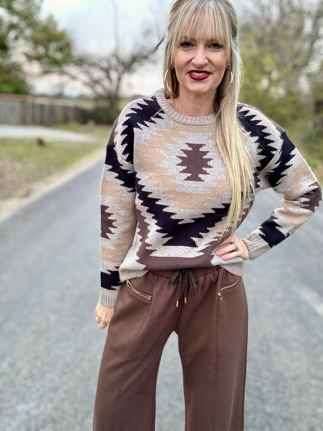 Get cozy and stylish in The Canyon sweater. This classic pullover features a neutral Aztec print and is made with a warm and comfortable knit. Perfect for both casual and dressy occasions, this sweater is the perfect addition to any wardrobe.