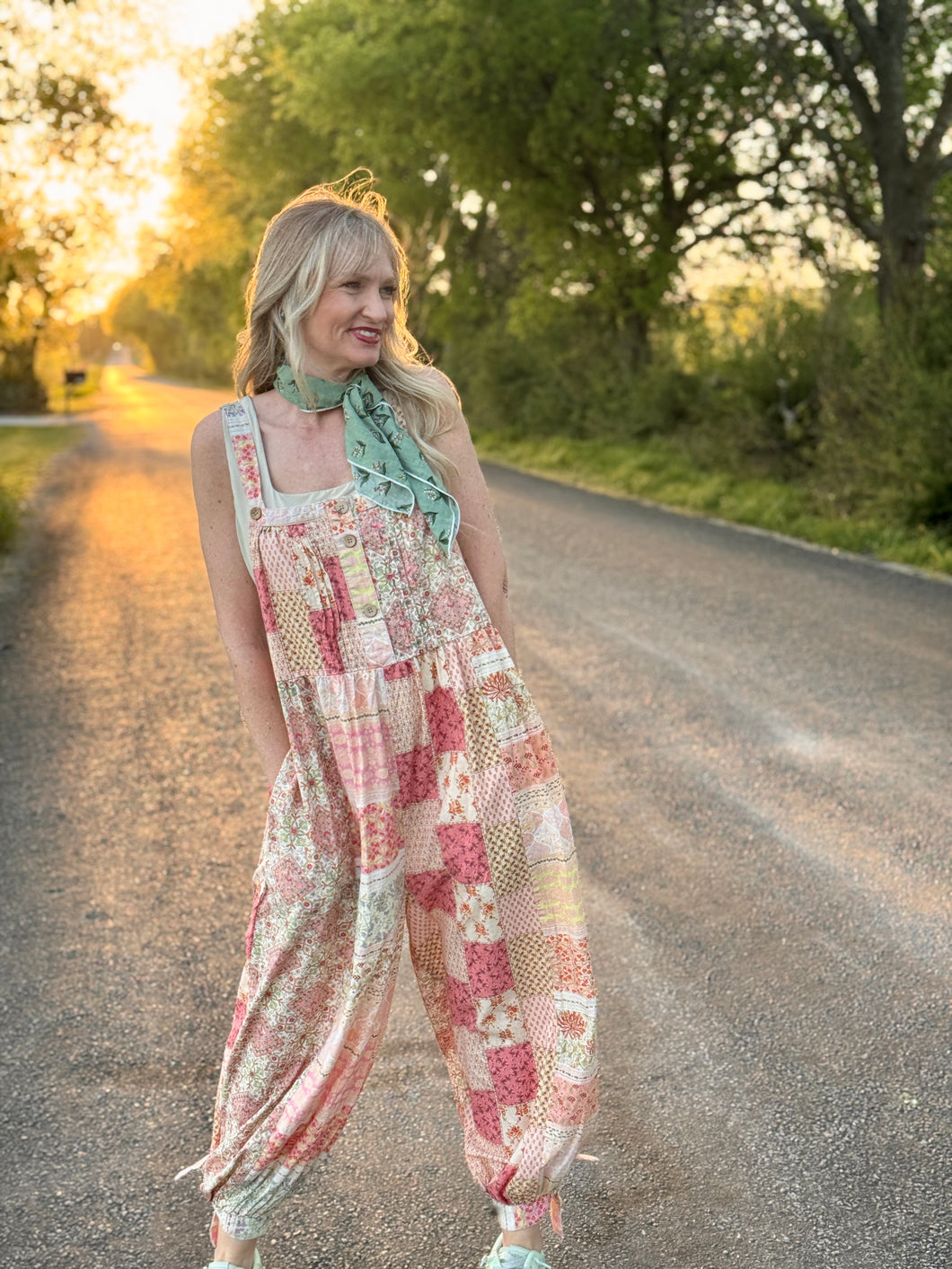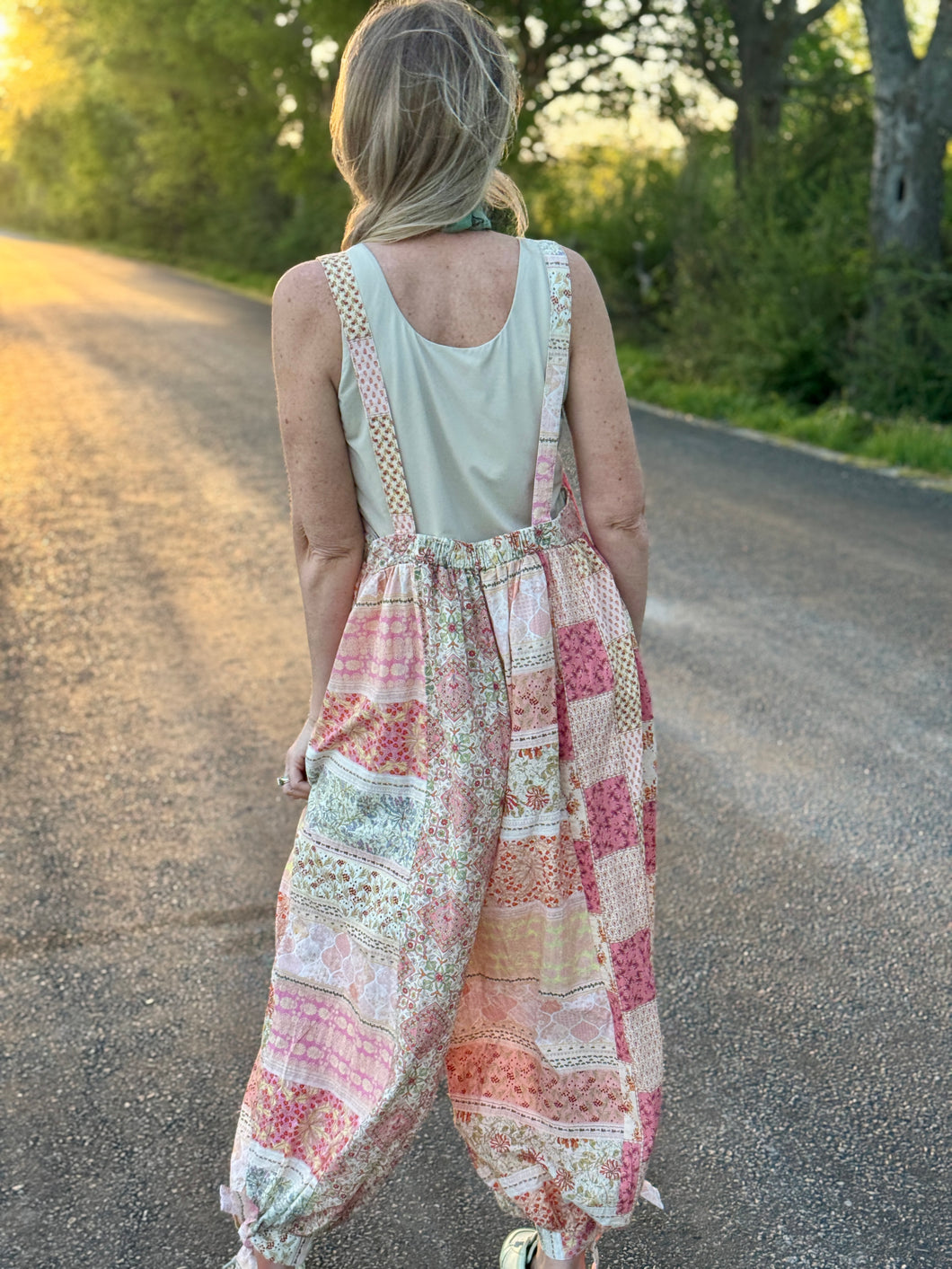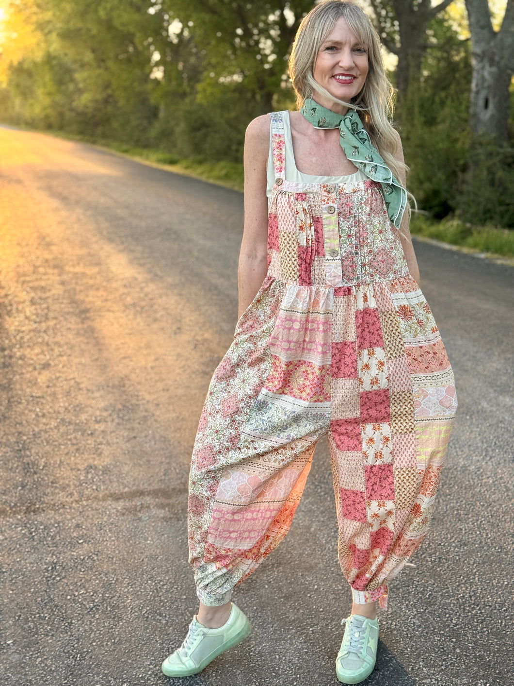 Embrace effortless bohemian style with The Jubilee jumpsuit. This lightweight, airy patchwork design features relaxed balloon-style pants with adjustable ankle ties for a playful, personalized fit. Elastic waistband and adjustable straps ensure all-day comfort, while the patchwork detailing adds artistic flair. Perfect for warm weather adventures, casual outings, or laid-back gatherings. Move freely and breathe easy in this boho essential.