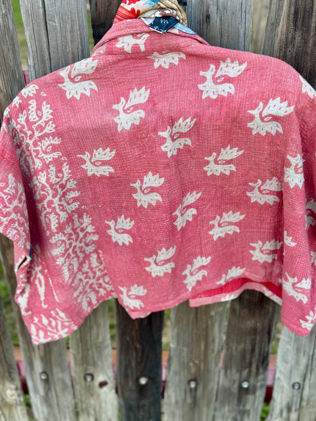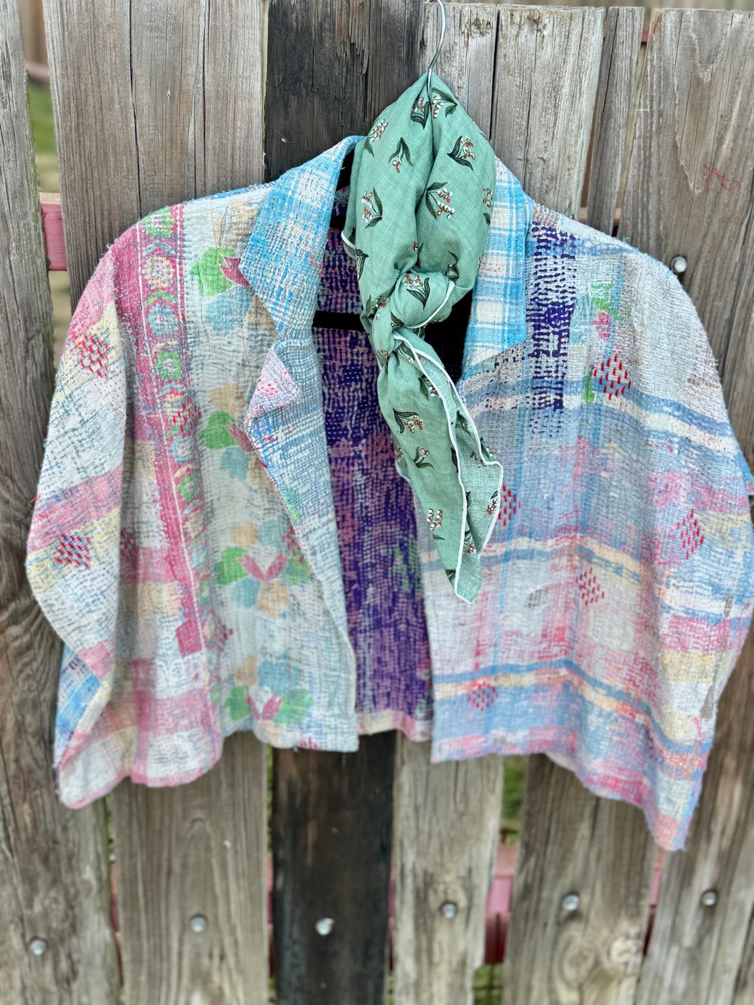 Introducing The Kantha Crop Jacket — a one-of-a-kind piece that blends artisanal charm with everyday versatility. Crafted from soft-washed fabric, this short-sleeve jacket features traditional kantha stitching that adds texture and character to any outfit. Labeled size L/XL, this jacket's relaxed fit makes it beautifully adaptable across multiple sizes, perfect for layering! Choose from two distinct color options to match your personal style. Each piece is unique, making this a standout addition to your wardrobe that celebrates handcrafted quality and timeless design.