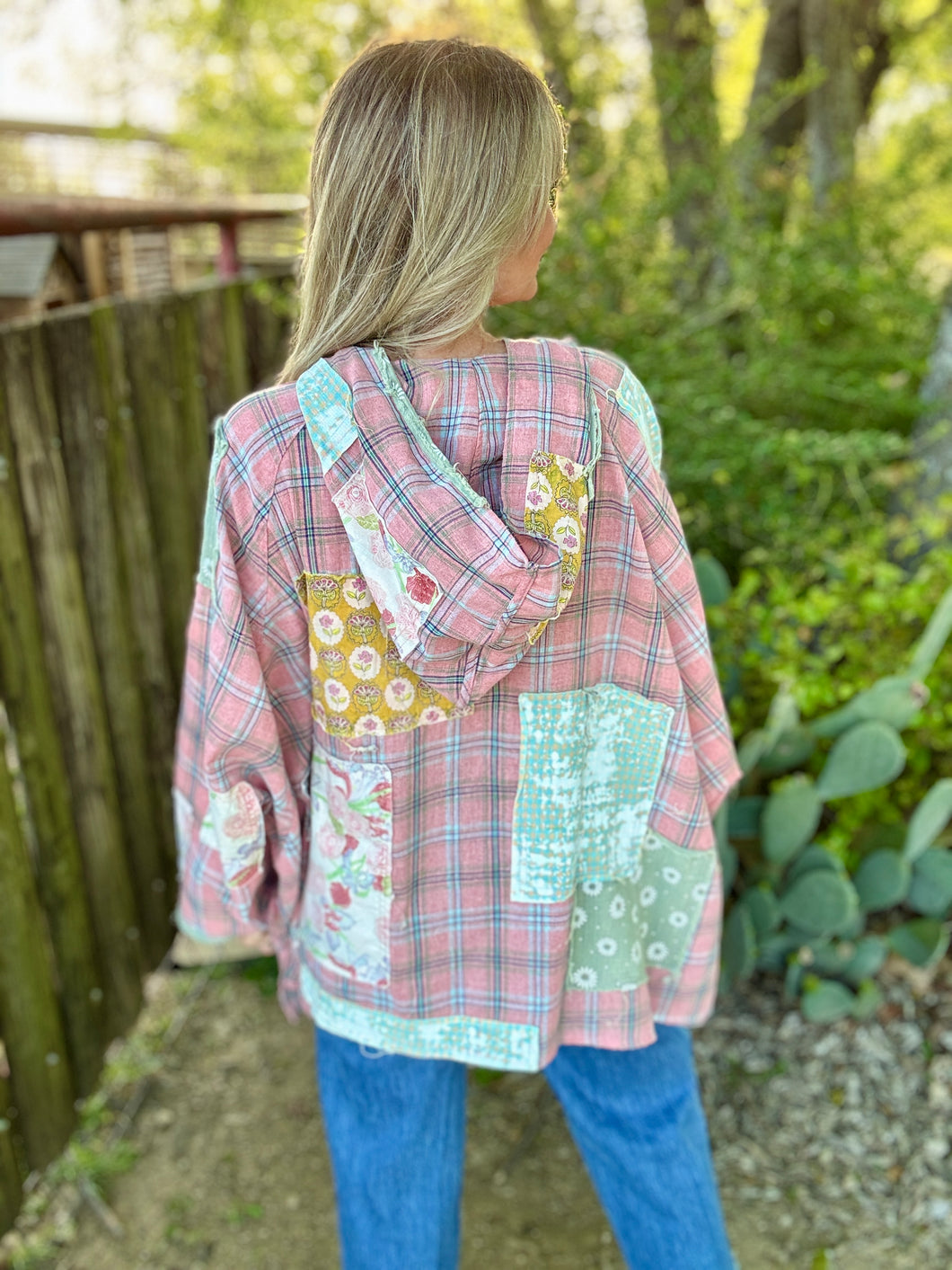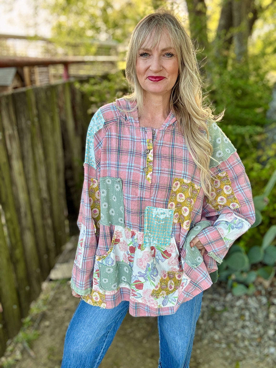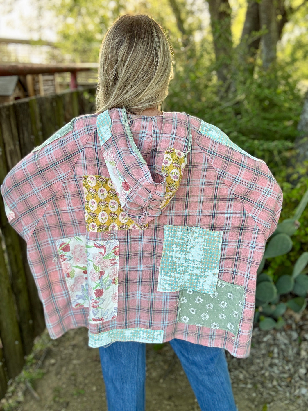 Embrace effortless comfort with The Pickin Patch Pullover, an oversized poncho-style hoodie that blends boho charm with modern ease. Crafted from super lightweight fabric, this patchwork design features eclectic mixed textures and colors. Perfect for layering or wearing solo, the relaxed fit drapes beautifully while keeping you cool and comfortable. The generous silhouette and soft construction make it ideal for casual days, festivals, or whenever you want to feel wrapped in cozy style. A versatile staple that brings artistic flair to any wardrobe.please note! These run roomy and are made to be an oversized boho look