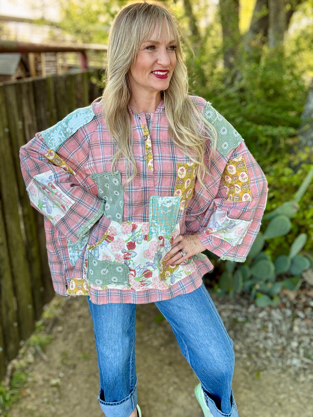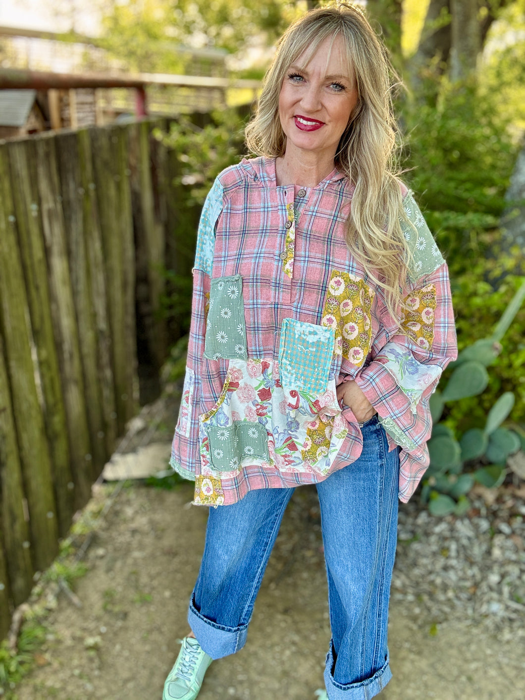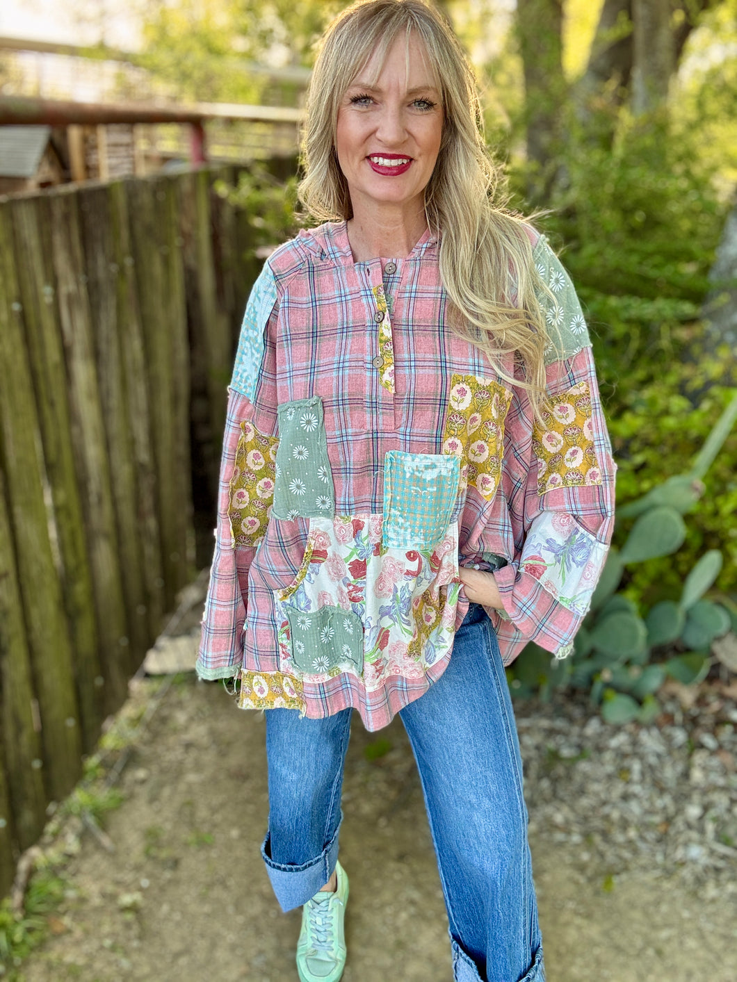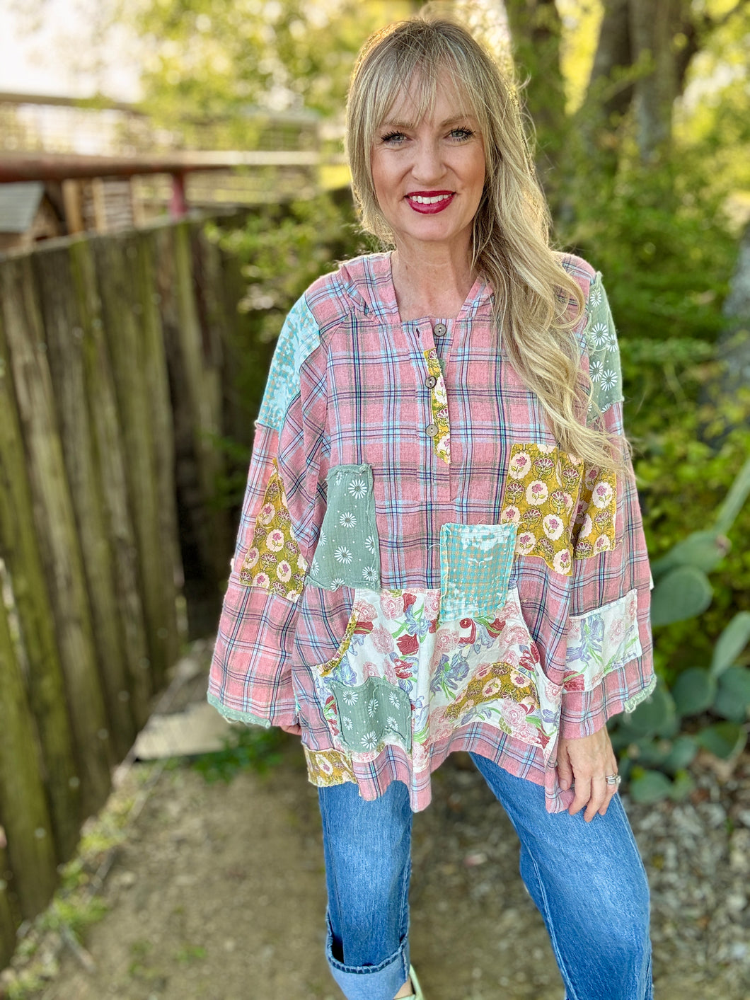 Embrace effortless comfort with The Pickin Patch Pullover, an oversized poncho-style hoodie that blends boho charm with modern ease. Crafted from super lightweight fabric, this patchwork design features eclectic mixed textures and colors. Perfect for layering or wearing solo, the relaxed fit drapes beautifully while keeping you cool and comfortable. The generous silhouette and soft construction make it ideal for casual days, festivals, or whenever you want to feel wrapped in cozy style. A versatile staple that brings artistic flair to any wardrobe.please note! These run roomy and are made to be an oversized boho look