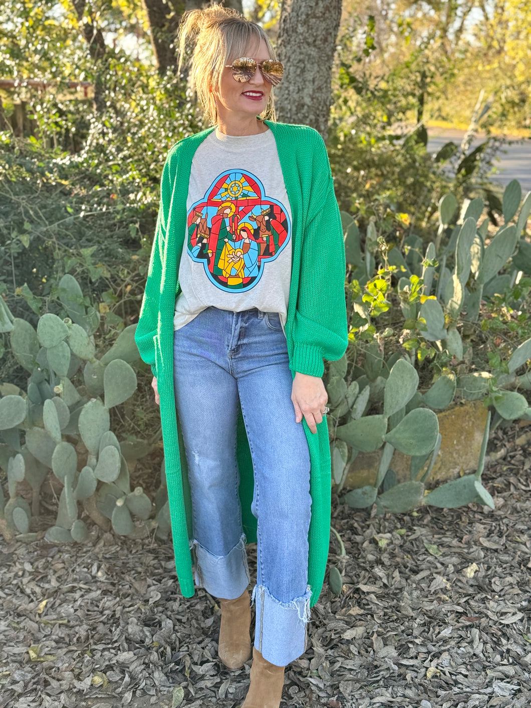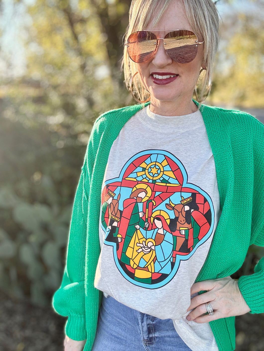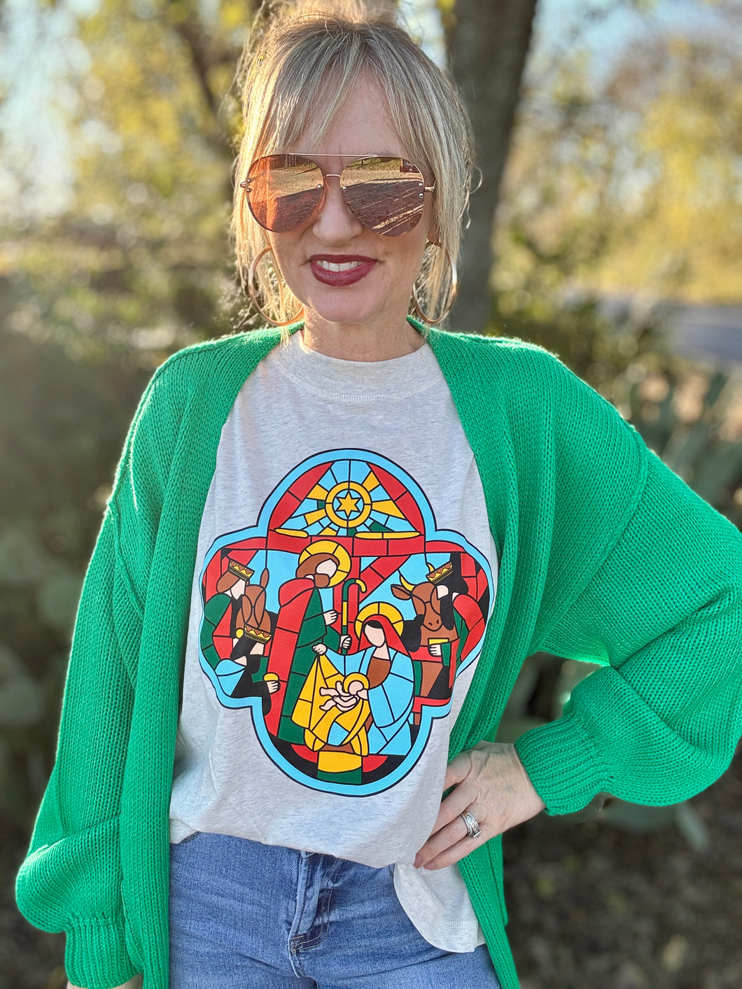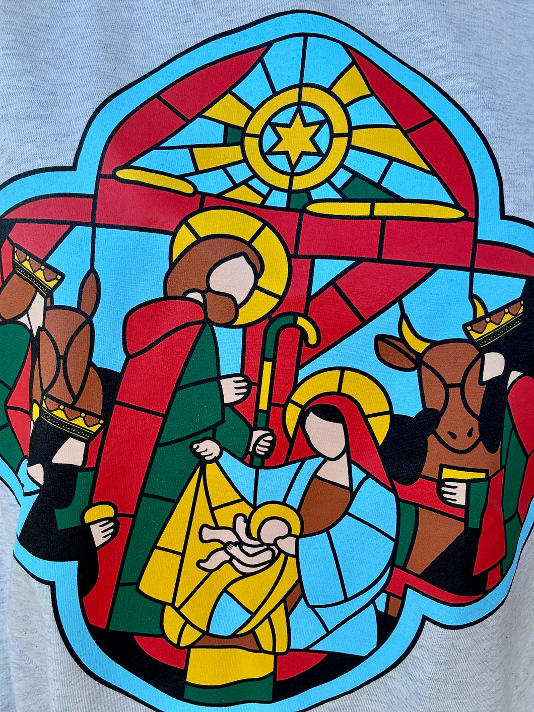 Featuring a stunning stain-glass look and a nativity scene, the Stainglass tee is a bold and eye-catching piece. Its boyfriend fit offers comfortable wear, while its vibrant colors make a statement. Add a touch of artistic flair to your wardrobe with this one-of-a-kind tee.