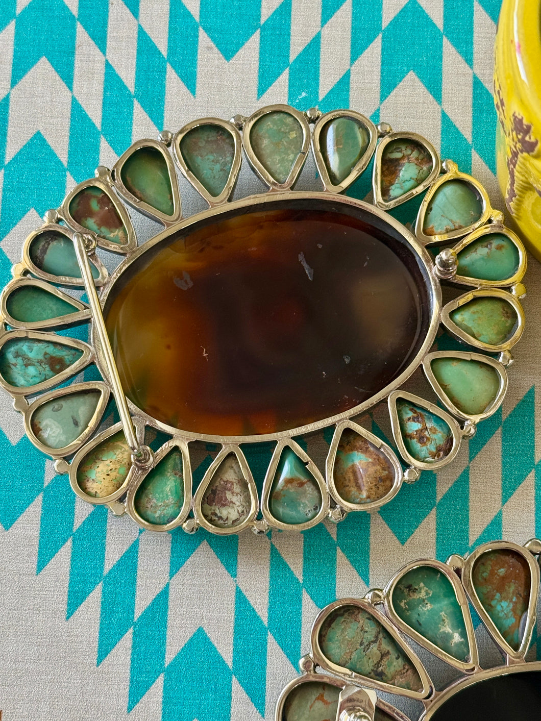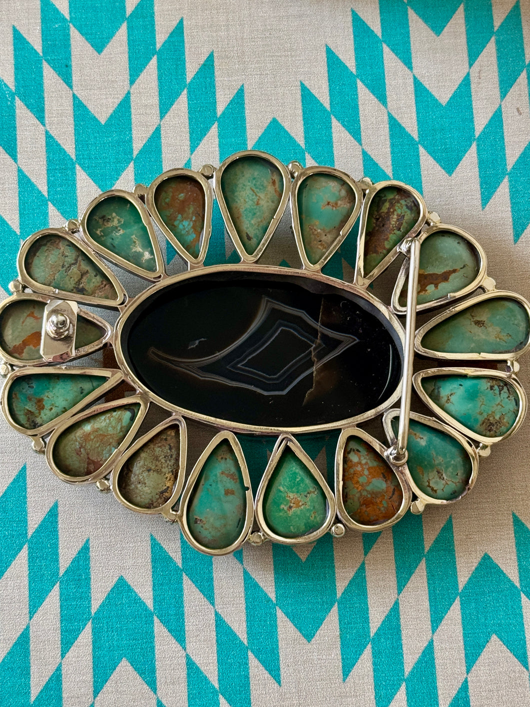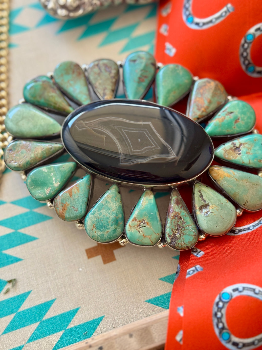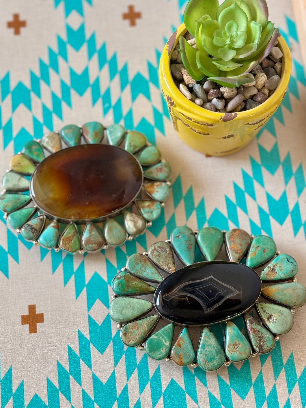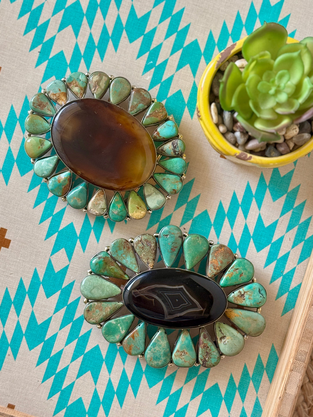 The Bonanza Buckles bring authentic Western flair to your wardrobe with striking statement design. Crafted with genuine turquoise and agate stones, each buckle showcases natural color variations and earthy beauty. Perfect for leather belts, these eye-catching pieces capture classic cowboy elegance while the quality gemstones ensure lasting durability. Ideal for rodeo enthusiasts, Western fashion lovers, or anyone seeking a bold accessory that tells a story of the frontier.
