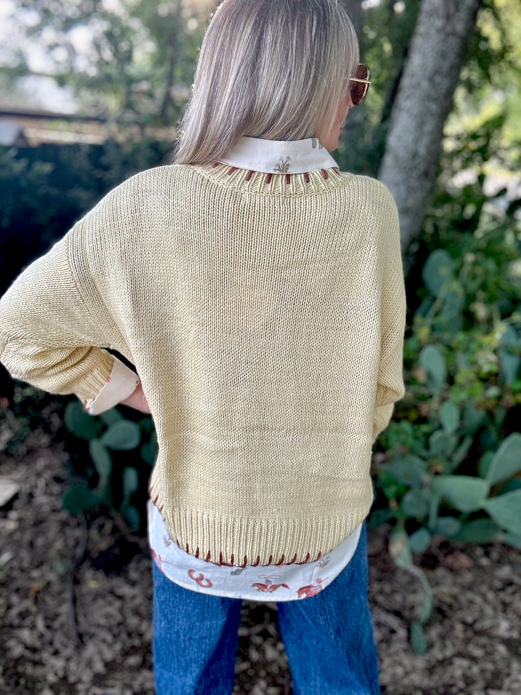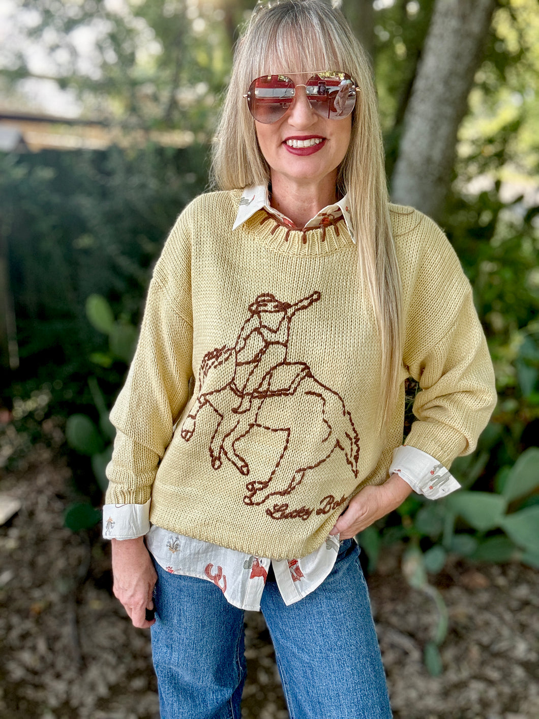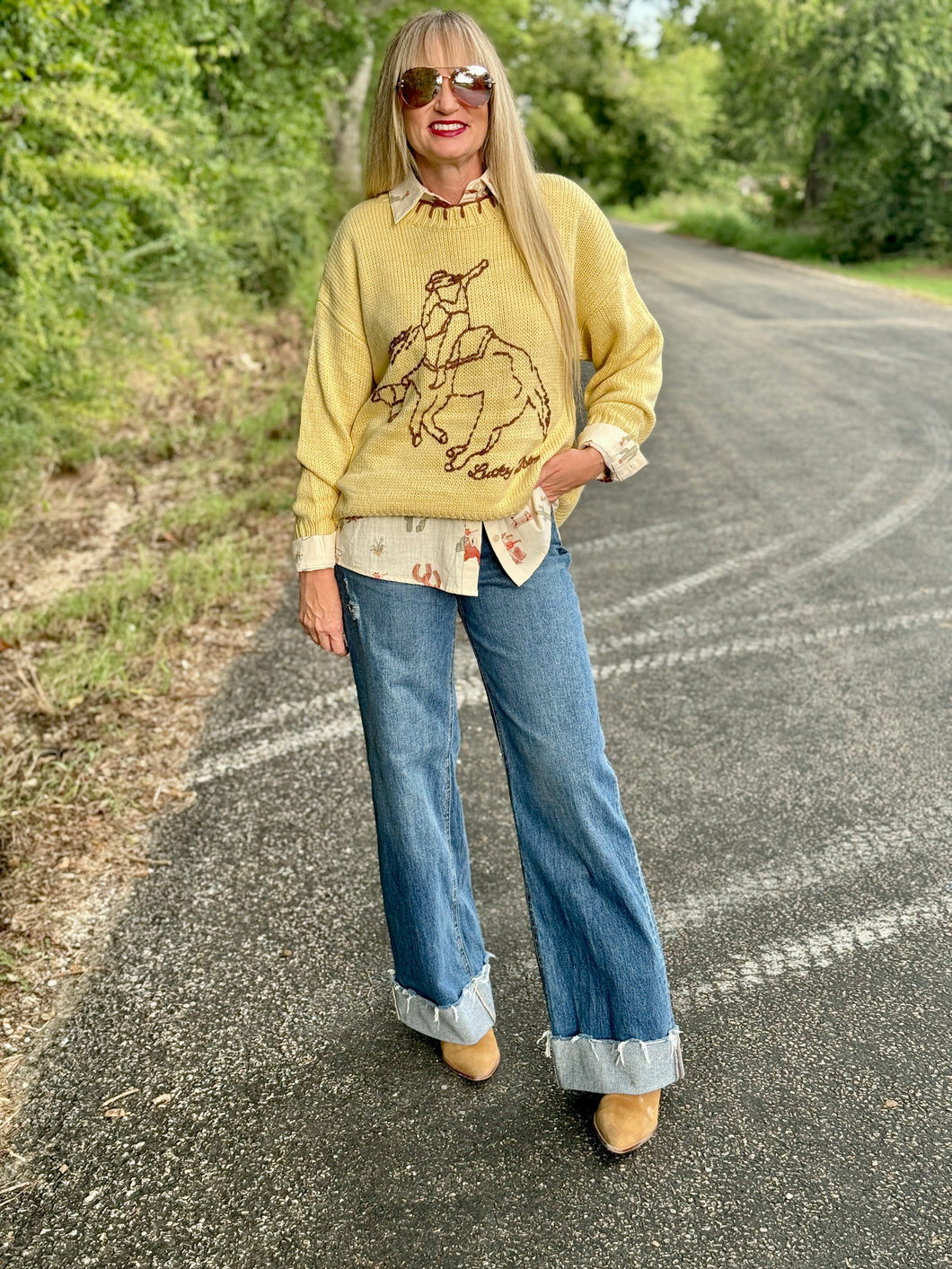 Get cozy and charming with The Butter Buckin sweater! This light yellow knitted sweater features playful brown stitching that brings a bucking horse design to life. Its relaxed fit ensures all-day comfort, perfect for laid-back days with a touch of wild west spirit. This is shown layered with the hardy button up, sold seperately