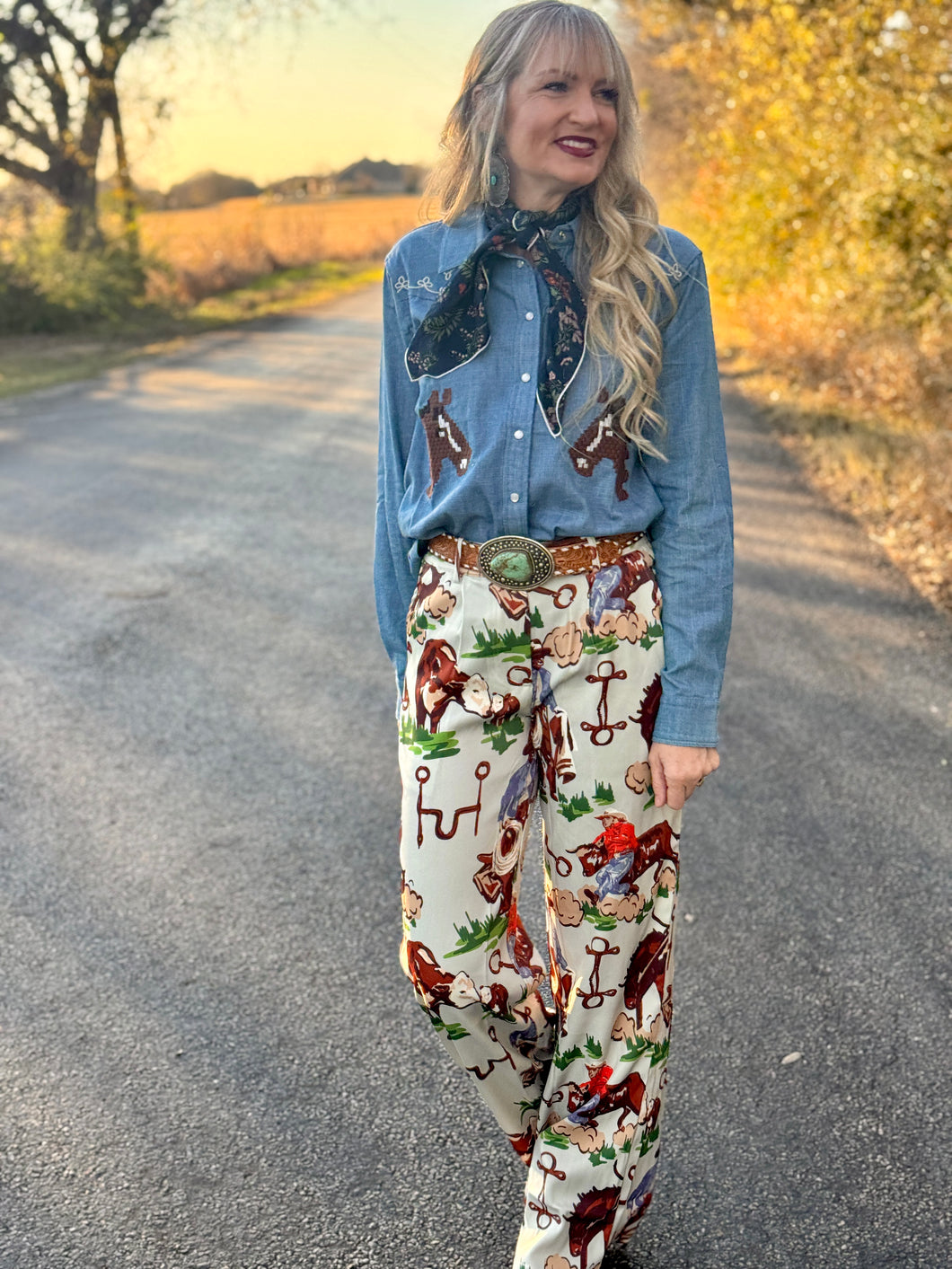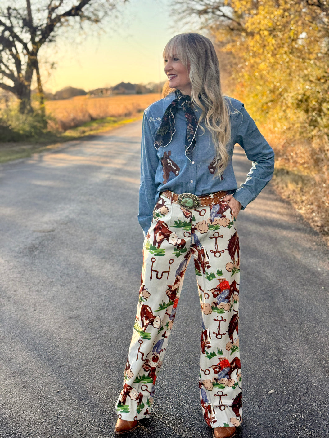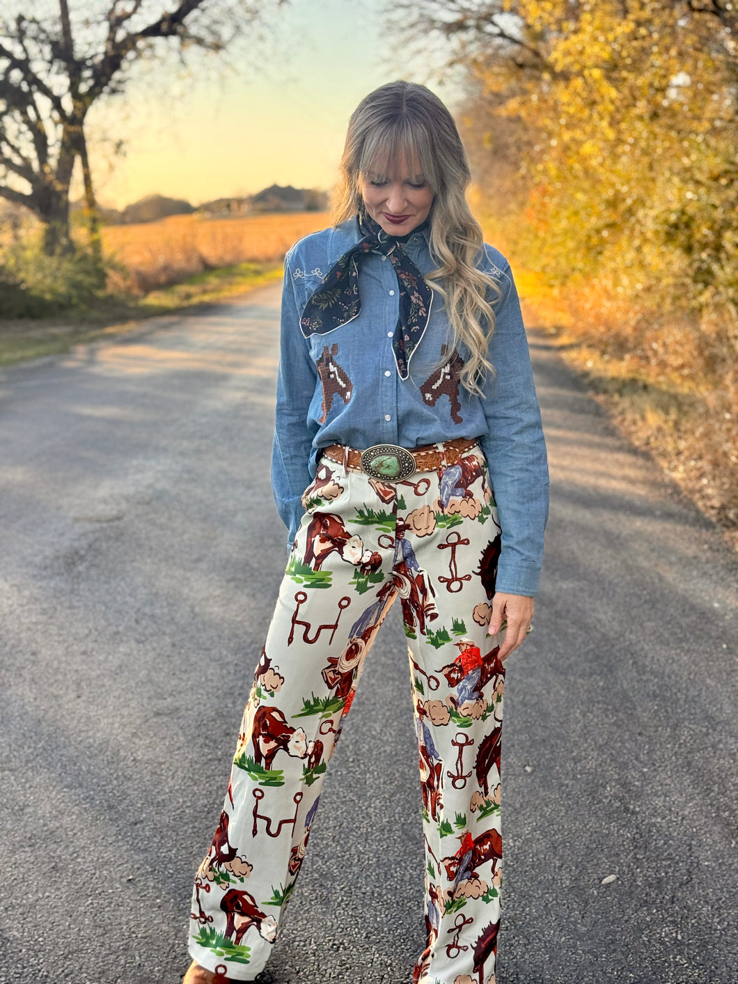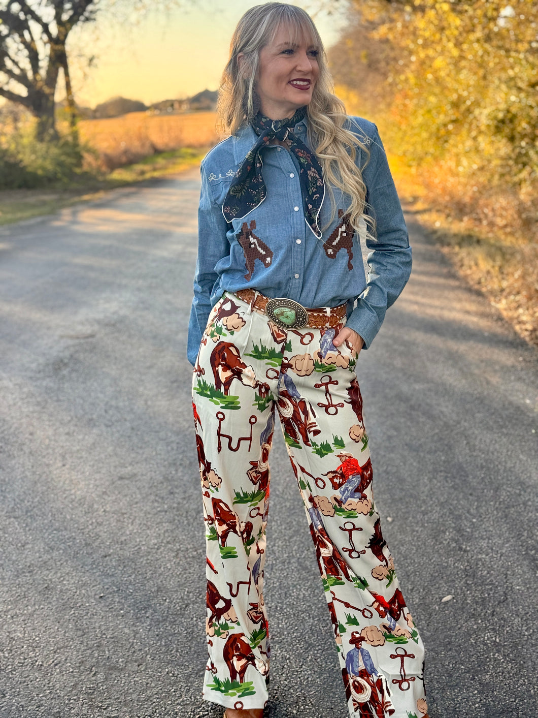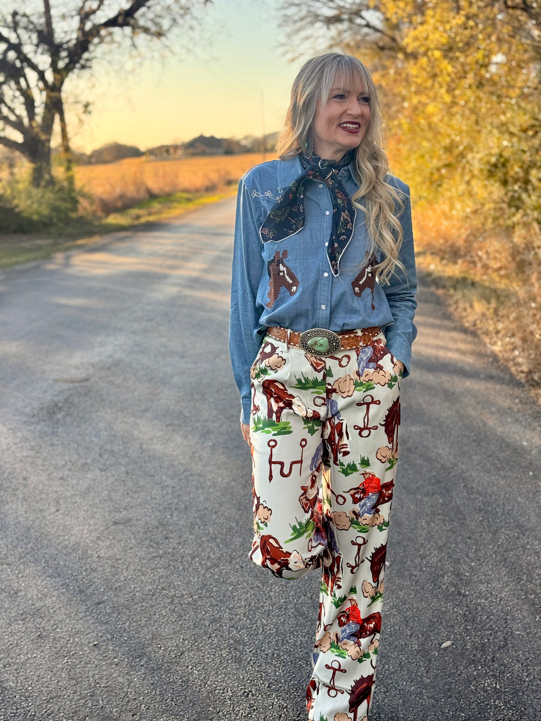 Saddle up for the office in these western print slacks that blend rugged style with polished professionalism. Featuring a sharp western aesthetic, these trousers deliver the perfect balance of business casual charm with authentic frontier flair. The tailored fit hugs you just right, while sturdy belt loops keep everything in place. Dual closure with zipper and button ensures a secure, comfortable fit all day long. Whether you're closing deals or hitting the town, these cattle chaps trousers prove you don't have to choose between looking sharp and staying true to your style.