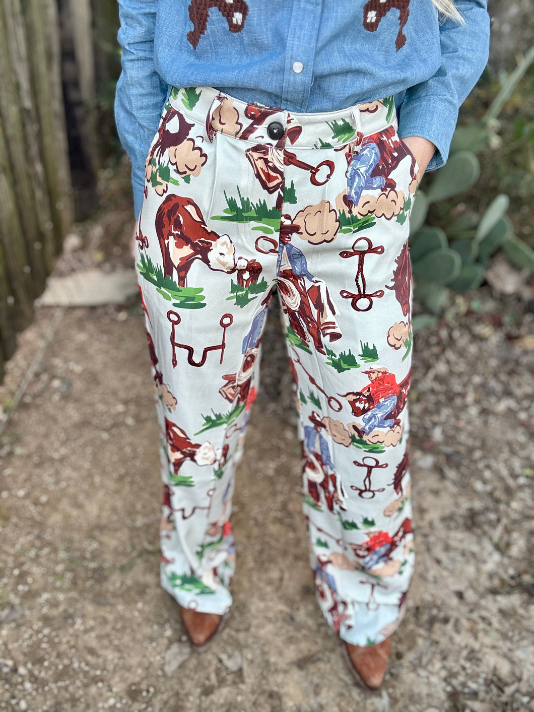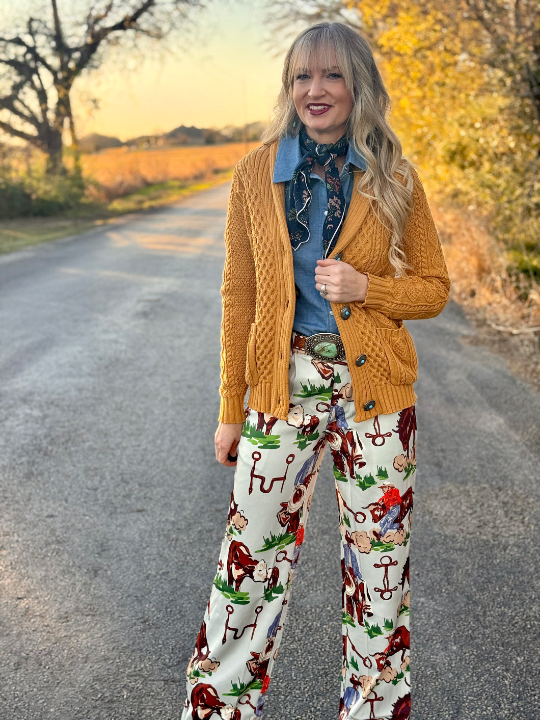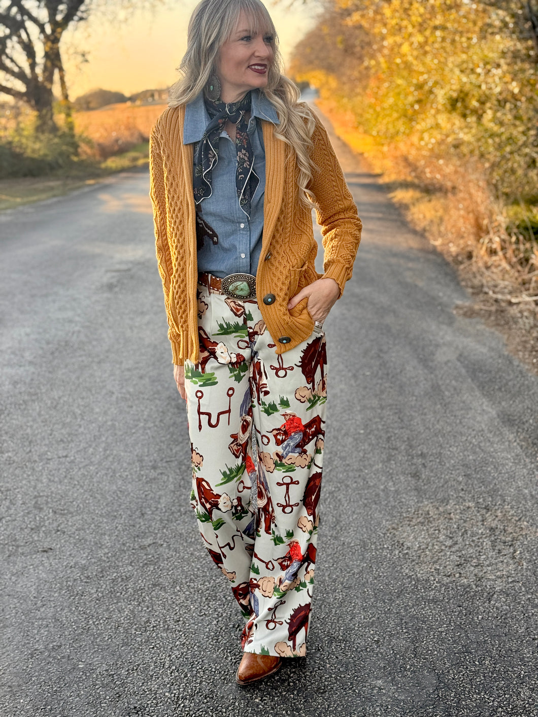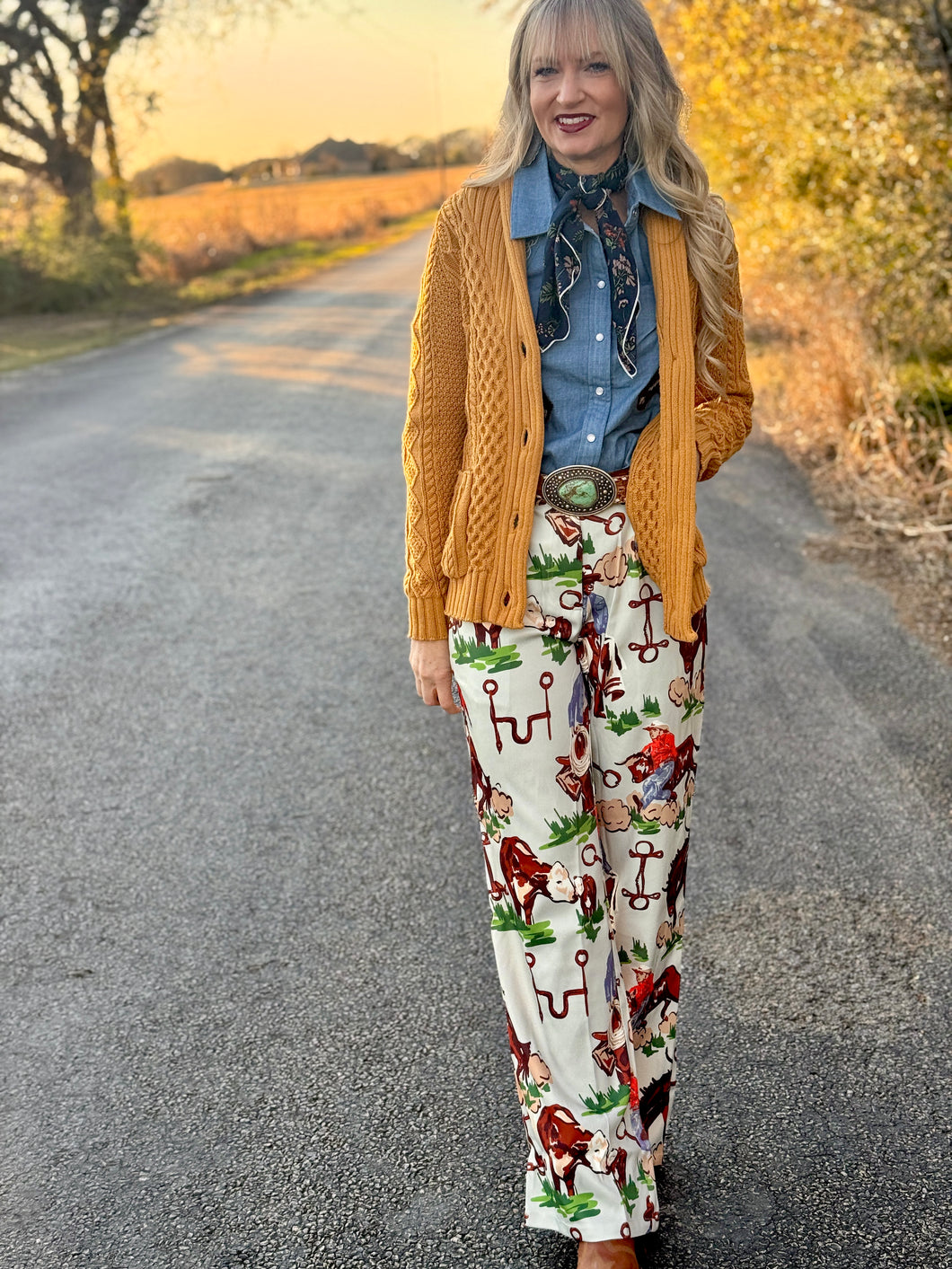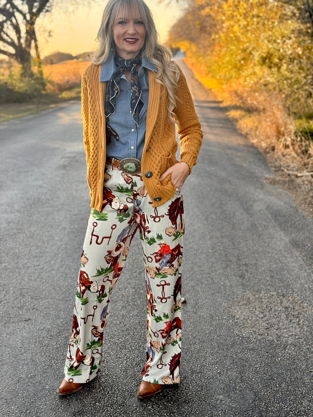 Saddle up for the office in these western print slacks that blend rugged style with polished professionalism. Featuring a sharp western aesthetic, these trousers deliver the perfect balance of business casual charm with authentic frontier flair. The tailored fit hugs you just right, while sturdy belt loops keep everything in place. Dual closure with zipper and button ensures a secure, comfortable fit all day long. Whether you're closing deals or hitting the town, these cattle chaps trousers prove you don't have to choose between looking sharp and staying true to your style.