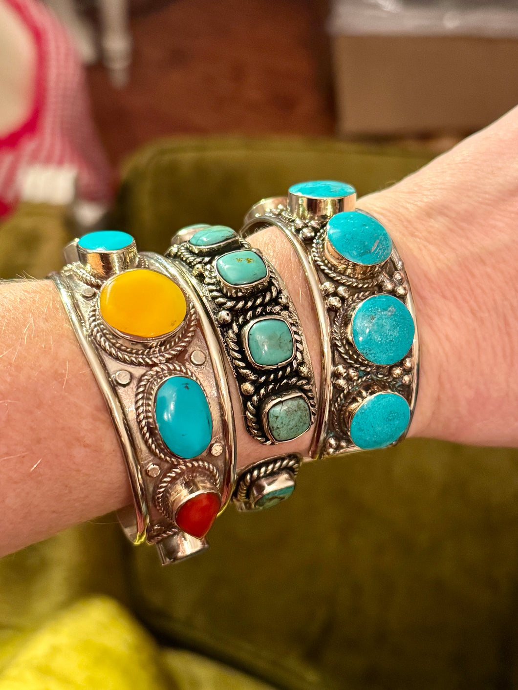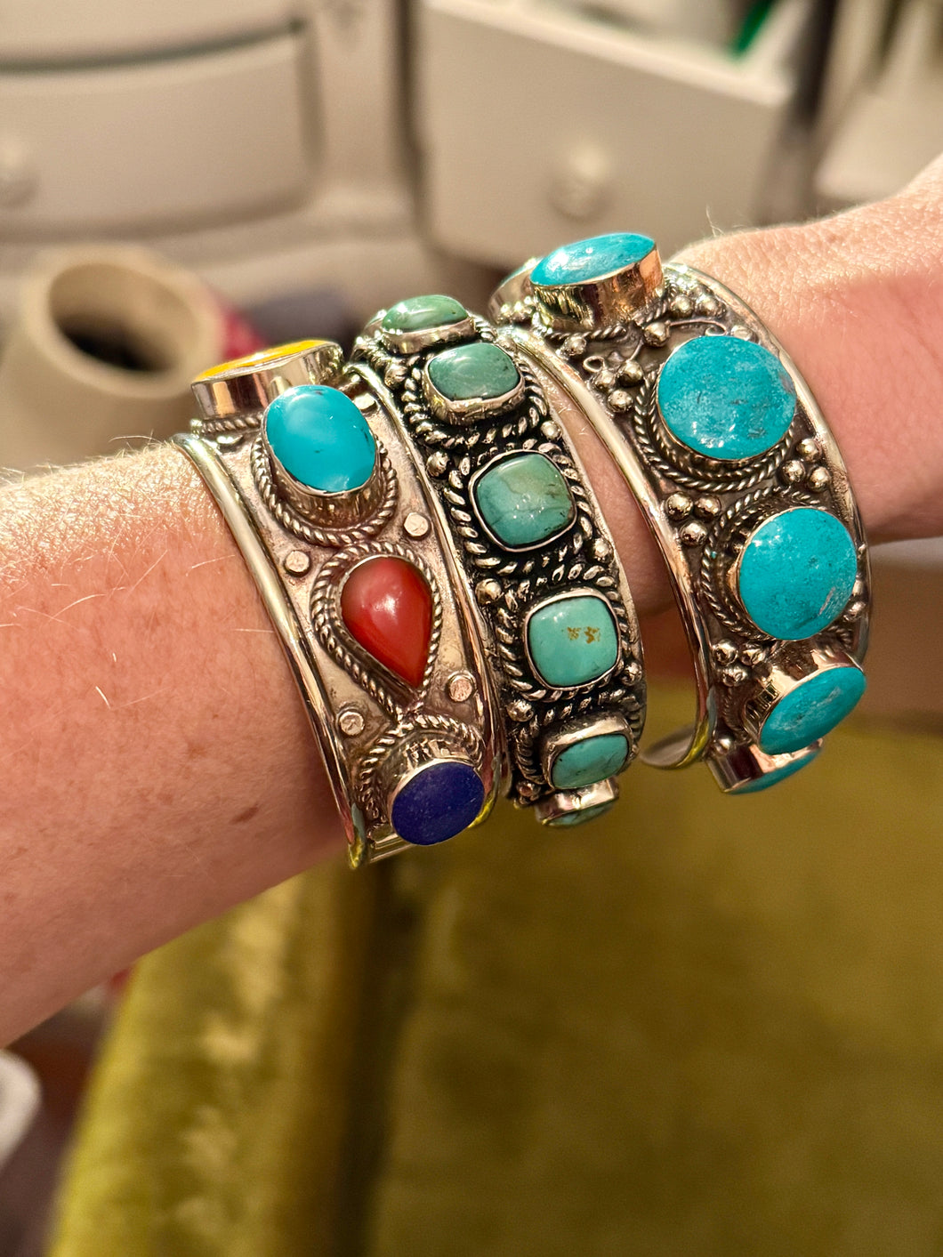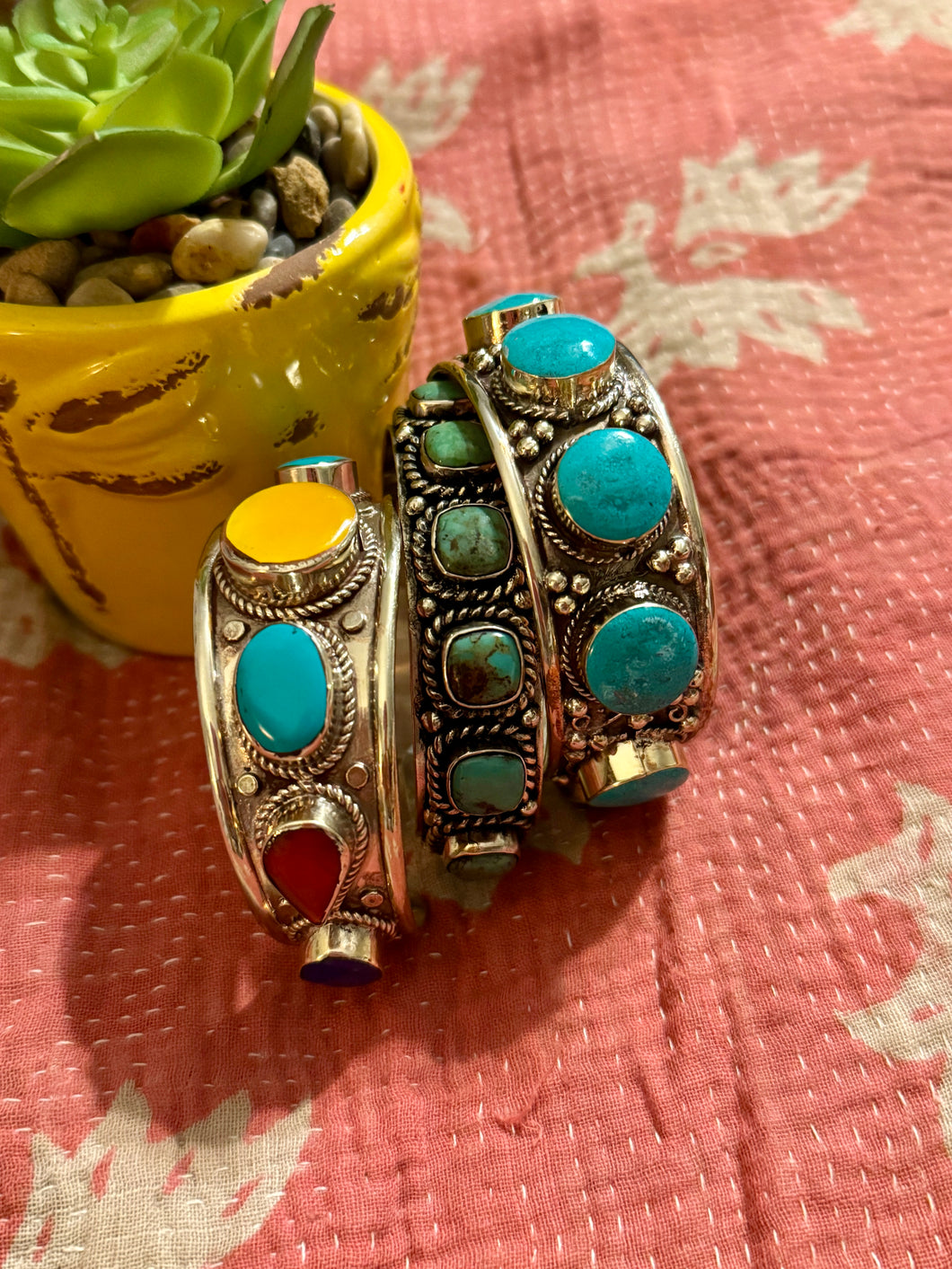 Make a statement with these stunning crescent cuffs that bend to fit your wrist perfectly. Each piece features gorgeous natural stones—choose classic turquoise or a vibrant mix of colors—all nestled in rustic Tibetan silver settings. Stack them, layer them, or wear solo for instant boho-chic vibes. Adjustable, eye-catching, and totally stackable, these beauties are your new go-to accessory for adding personality to any look.