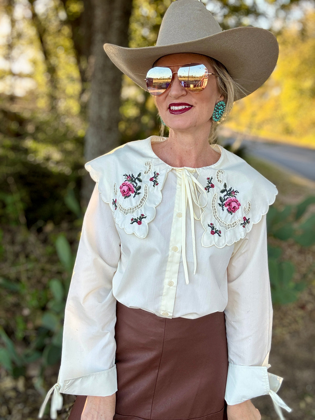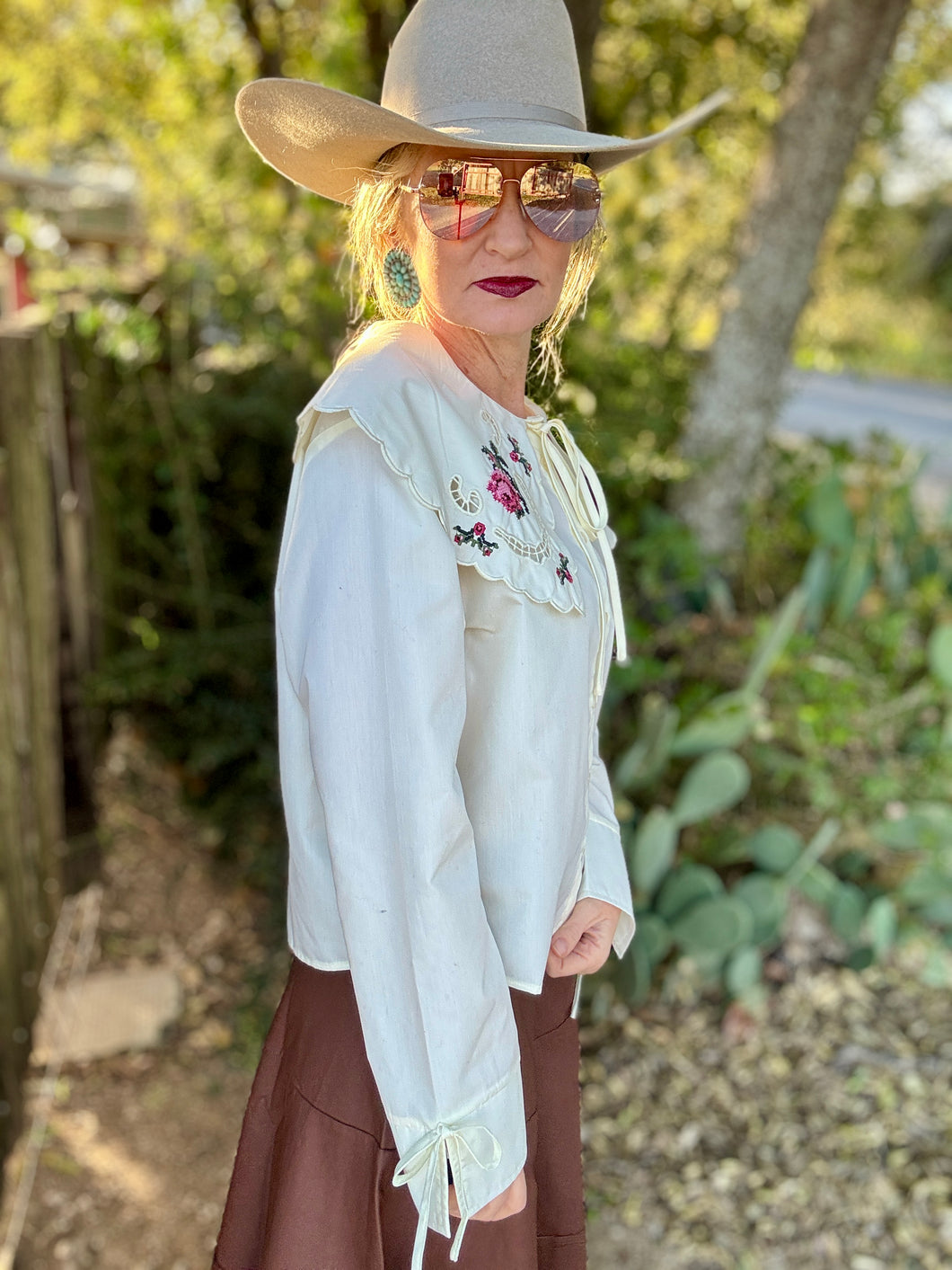 Woman wearing a white blouse with floral embroidery, sunglasses, and a wide-brimmed hat.