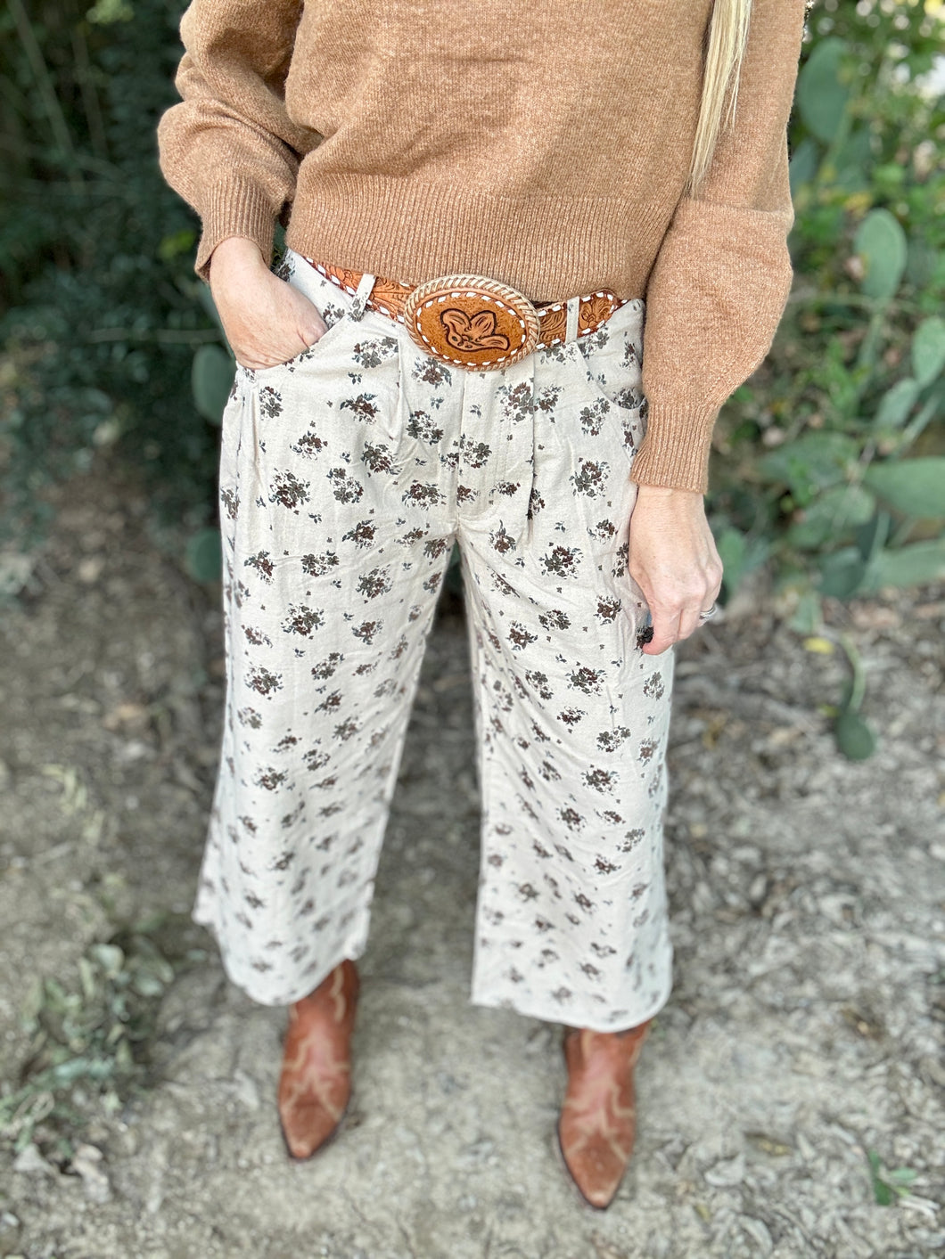 Step out in style with The Filly Floral Pants—lightweight, wide-legged, and cropped just at the ankle for a breezy, playful vibe. Featuring charming front pleats and a subtle floral print, these pants bring fun and comfort together in perfect harmony. Whether you're strolling through the park or heading out with friends, they add a fresh, flirty touch to your look. Make them western or keep them classic vintage!
