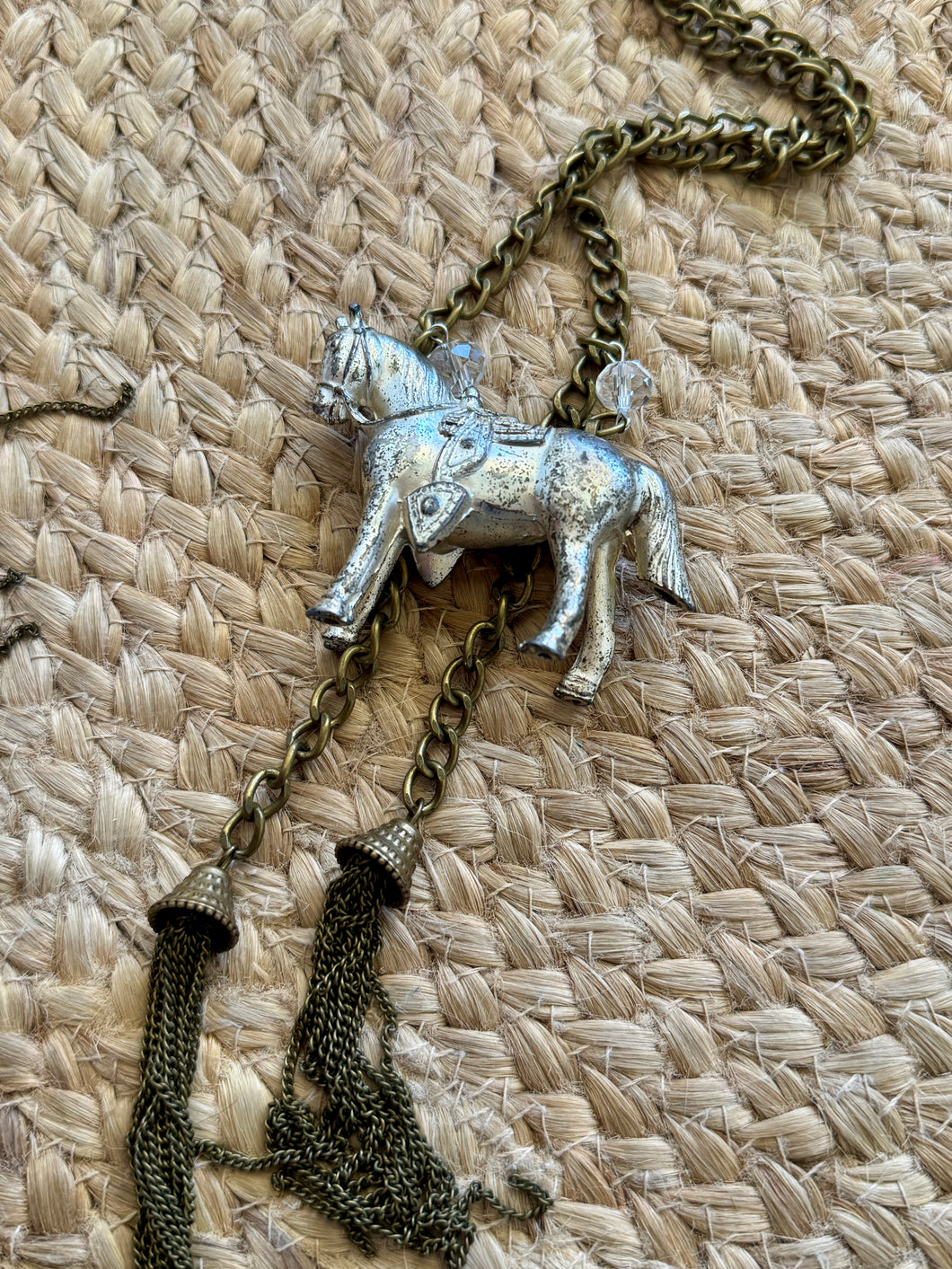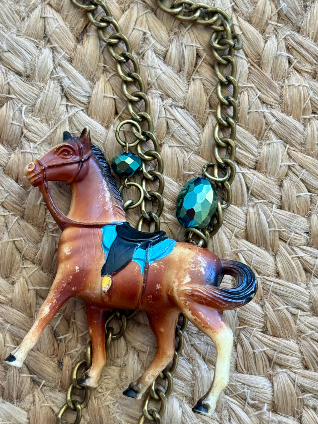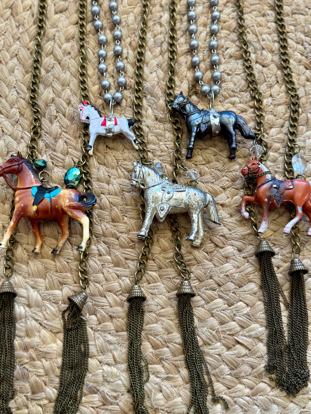 Each piece tells a story. These one-of-a-kind handmade vintage horse necklaces blend timeless equestrian charm with artisanal craftsmanship. Featuring unique details and authentic vintage-inspired design, every necklace is individually created to celebrate your love of horses. Perfect for collectors, equestrian enthusiasts, or anyone seeking a distinctive statement piece that won't be found anywhere else.