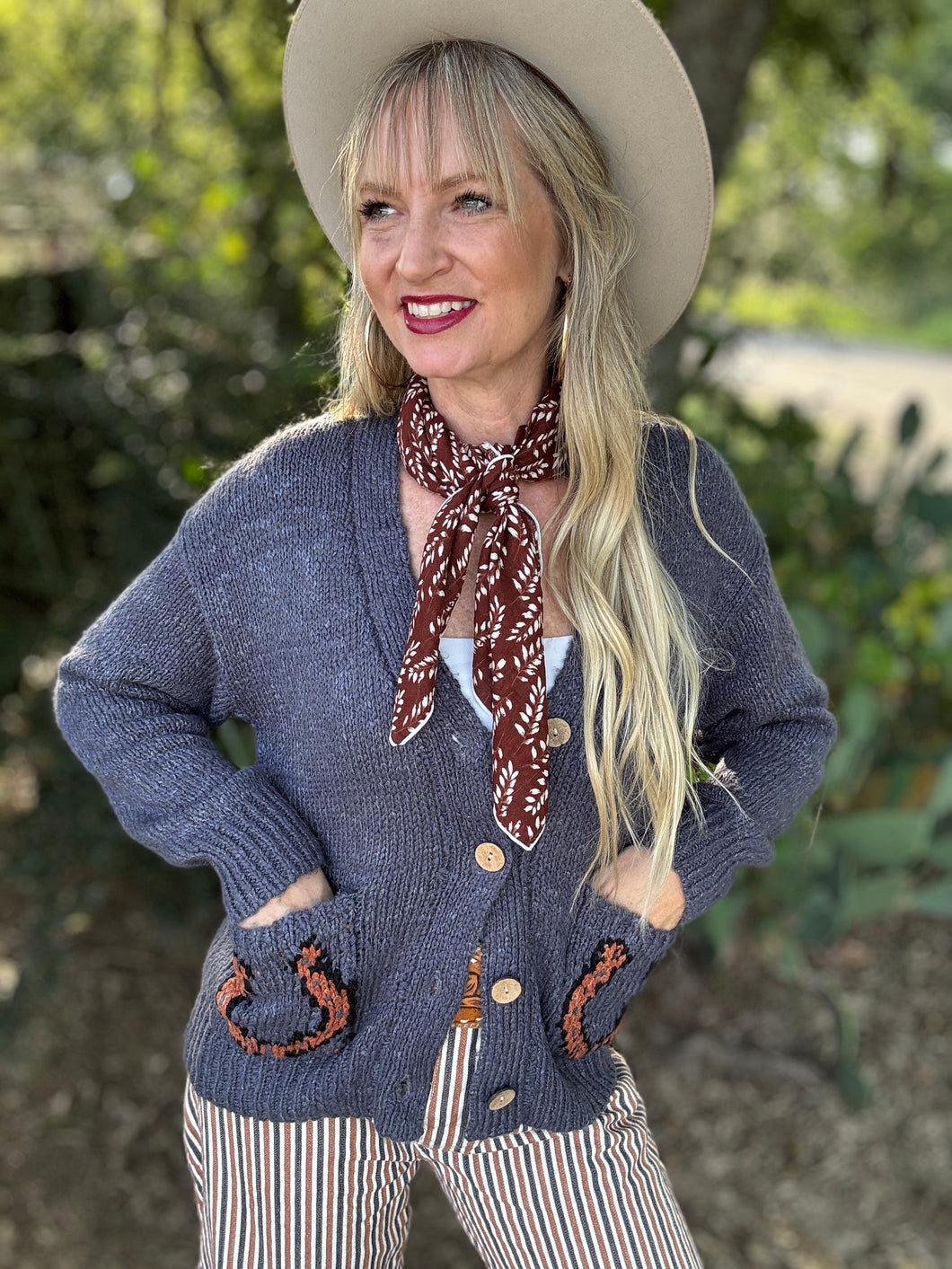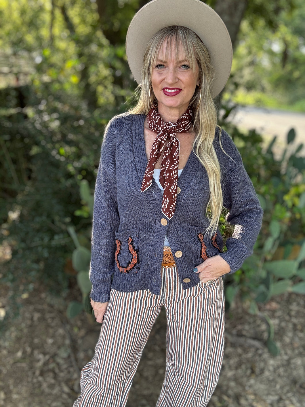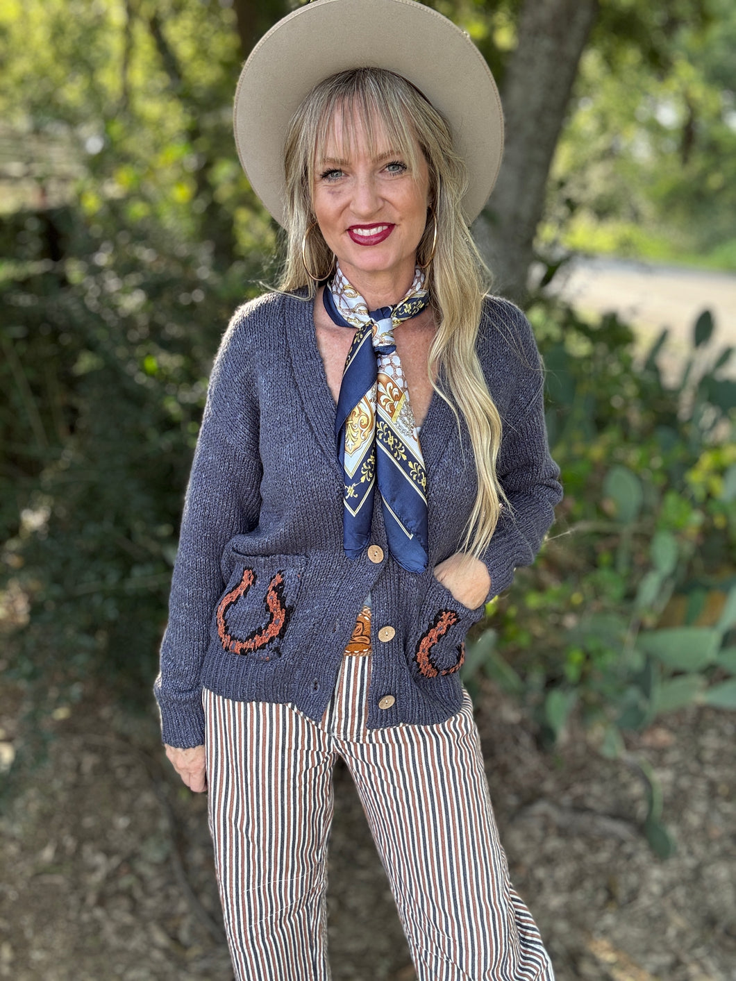 Wrap yourself in charm with The Midnight Rider Cardigan. This soft, cozy navy button-up features front pockets with horseshoes and a beautifully stitched horse on the back. Perfect for adding a classic questrian touch to your wardrobe while staying comfy all day.