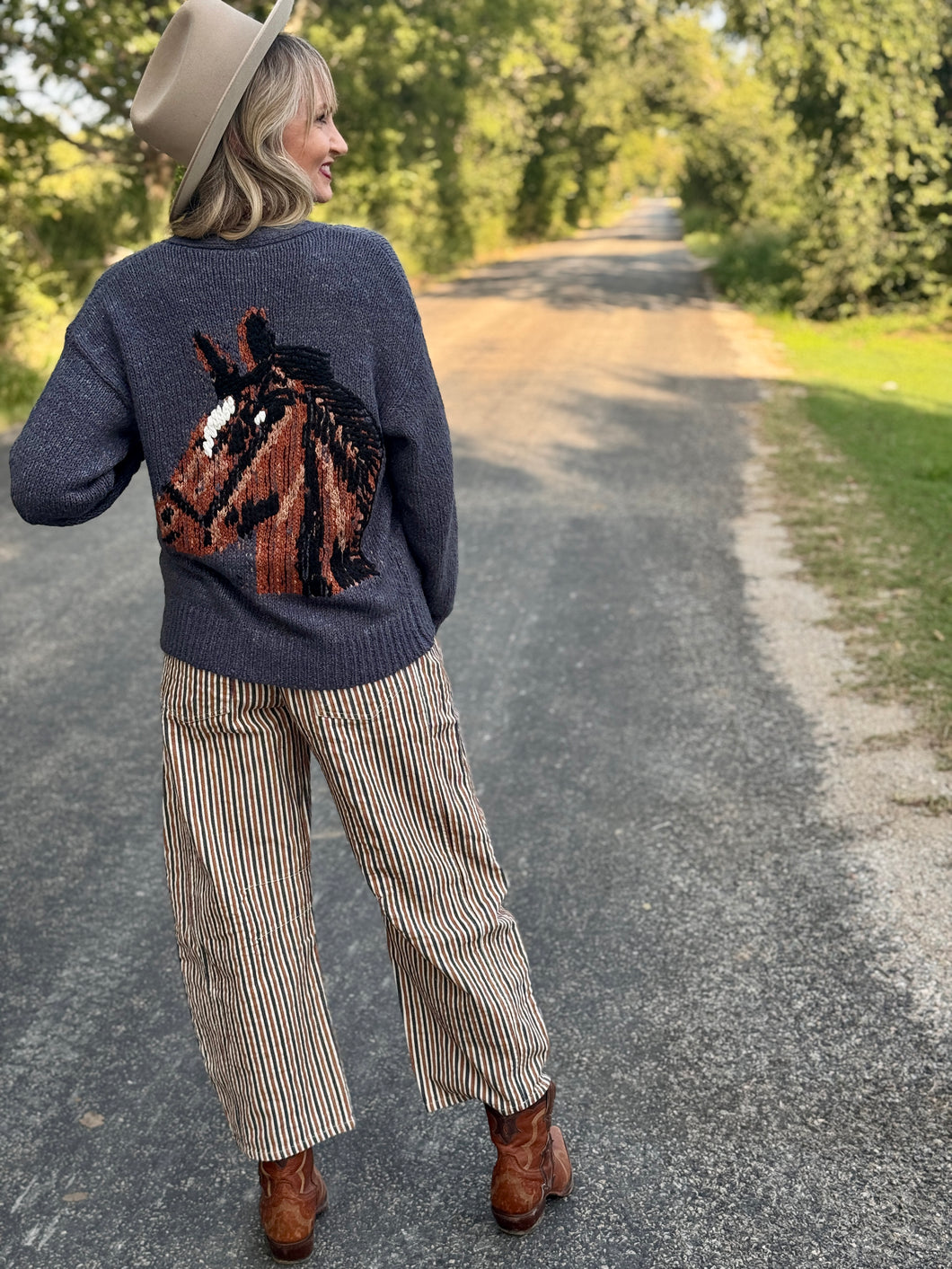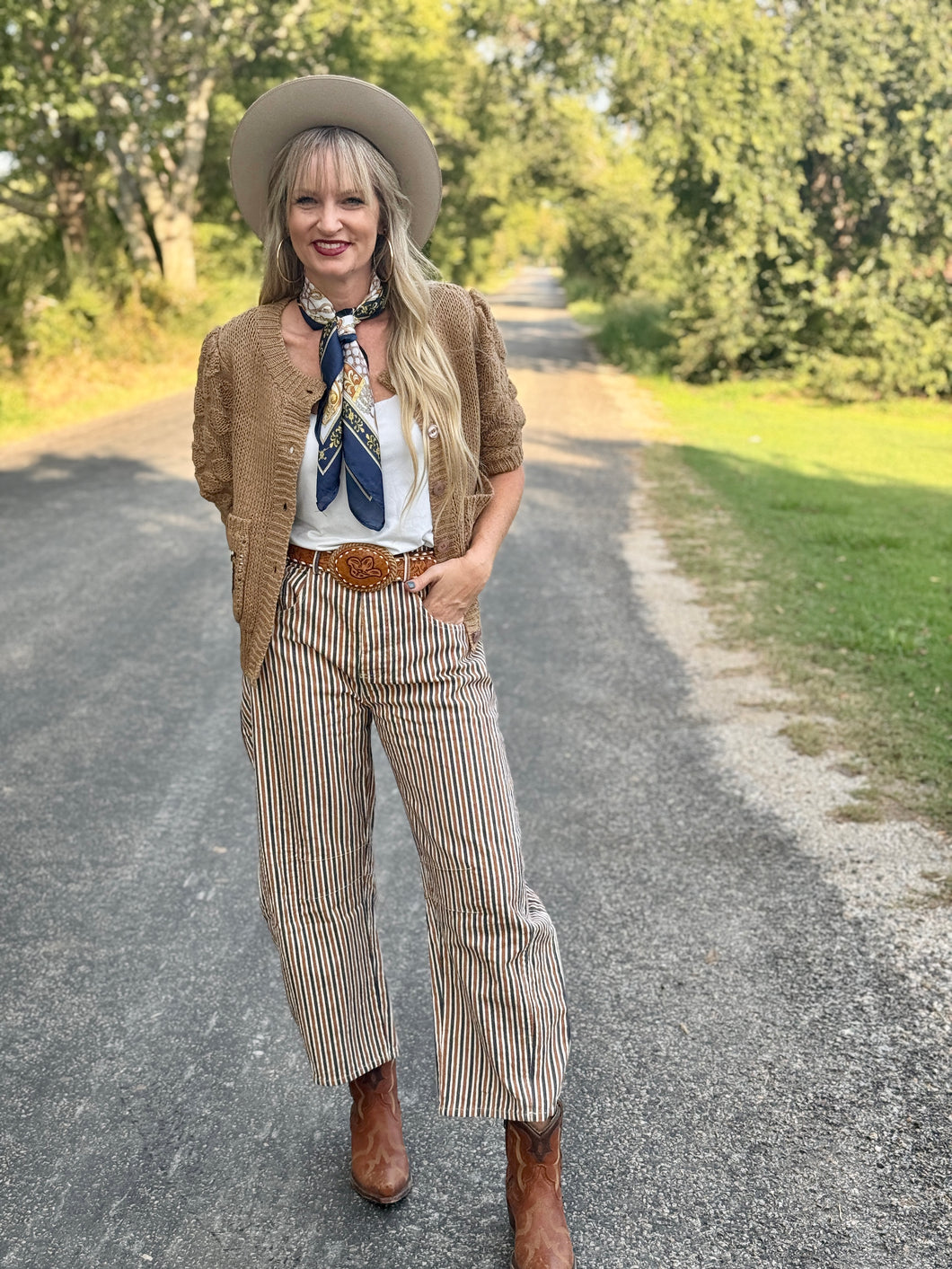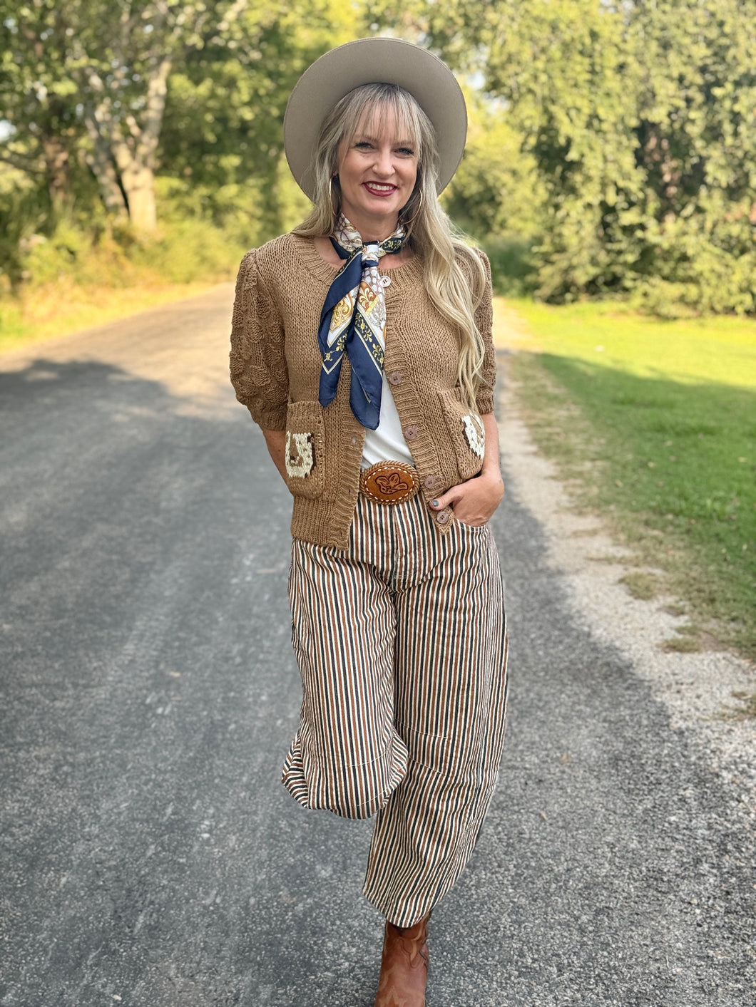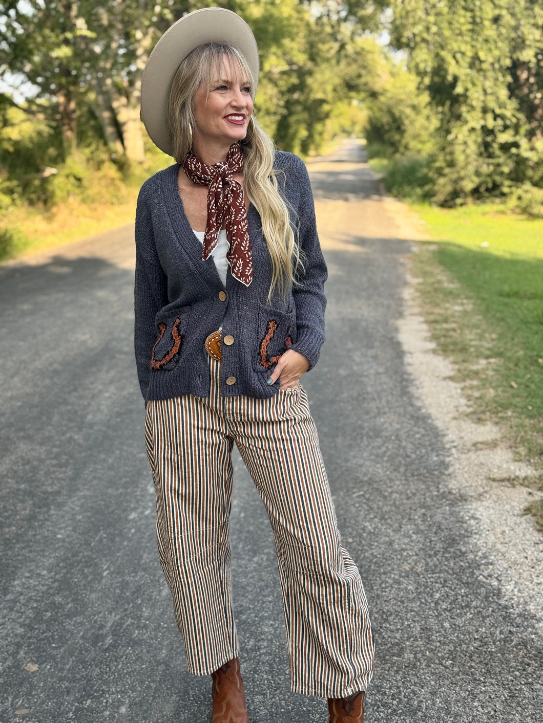 The Sienna Stripe Pants bring a fresh twist to your wardrobe with their playful tan and navy stripes. Designed in a trendy barrel style, these lightweight pants offer easy movement and all-day comfort. The classic button fly adds a charming detail, making them perfect for casual or dressy outings with a touch of fun flair.