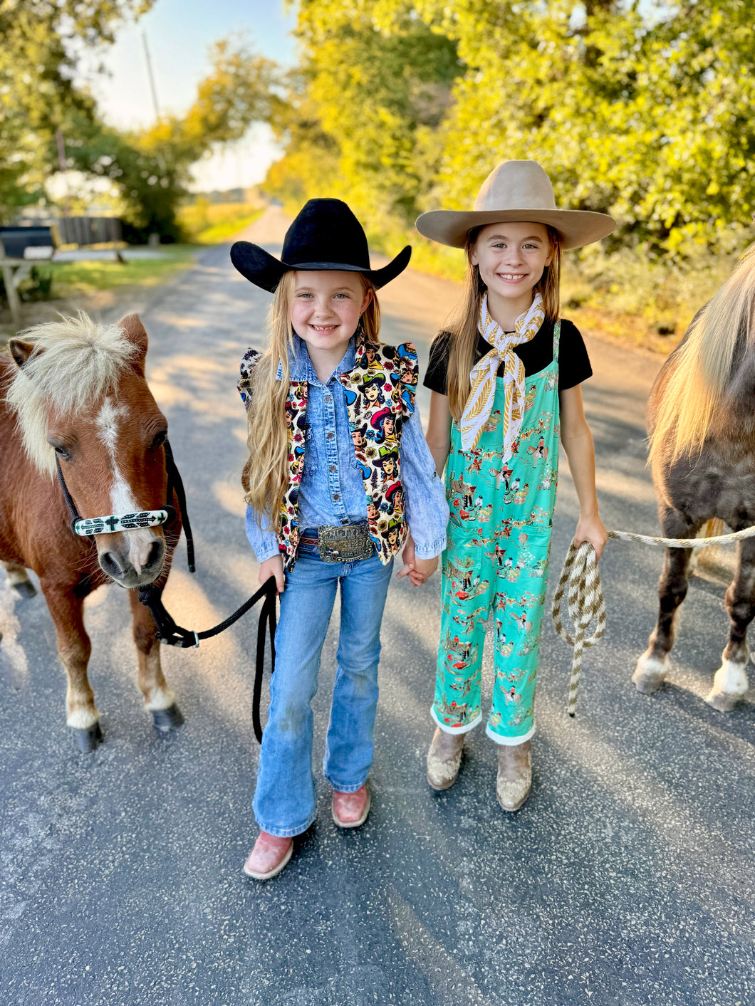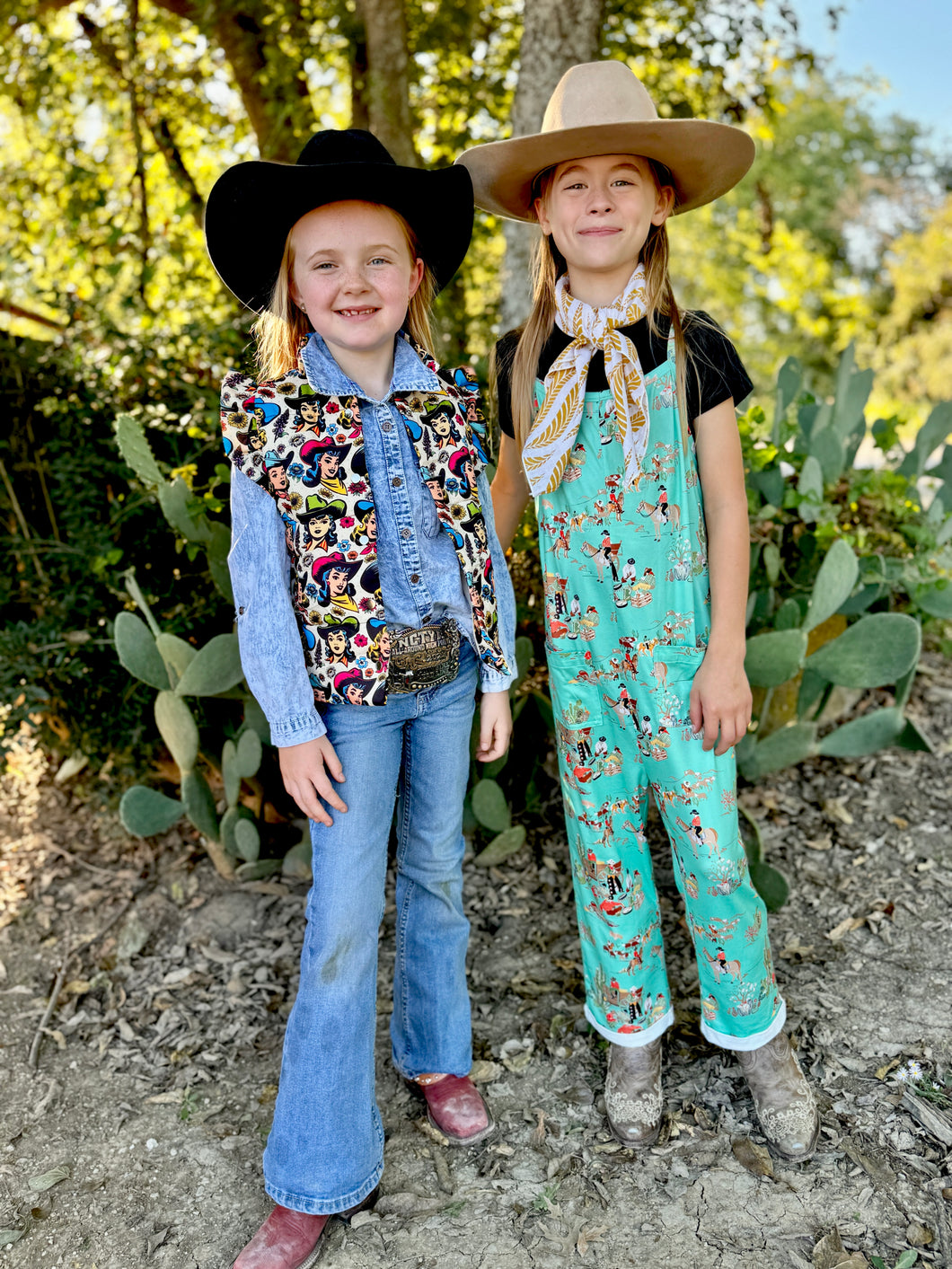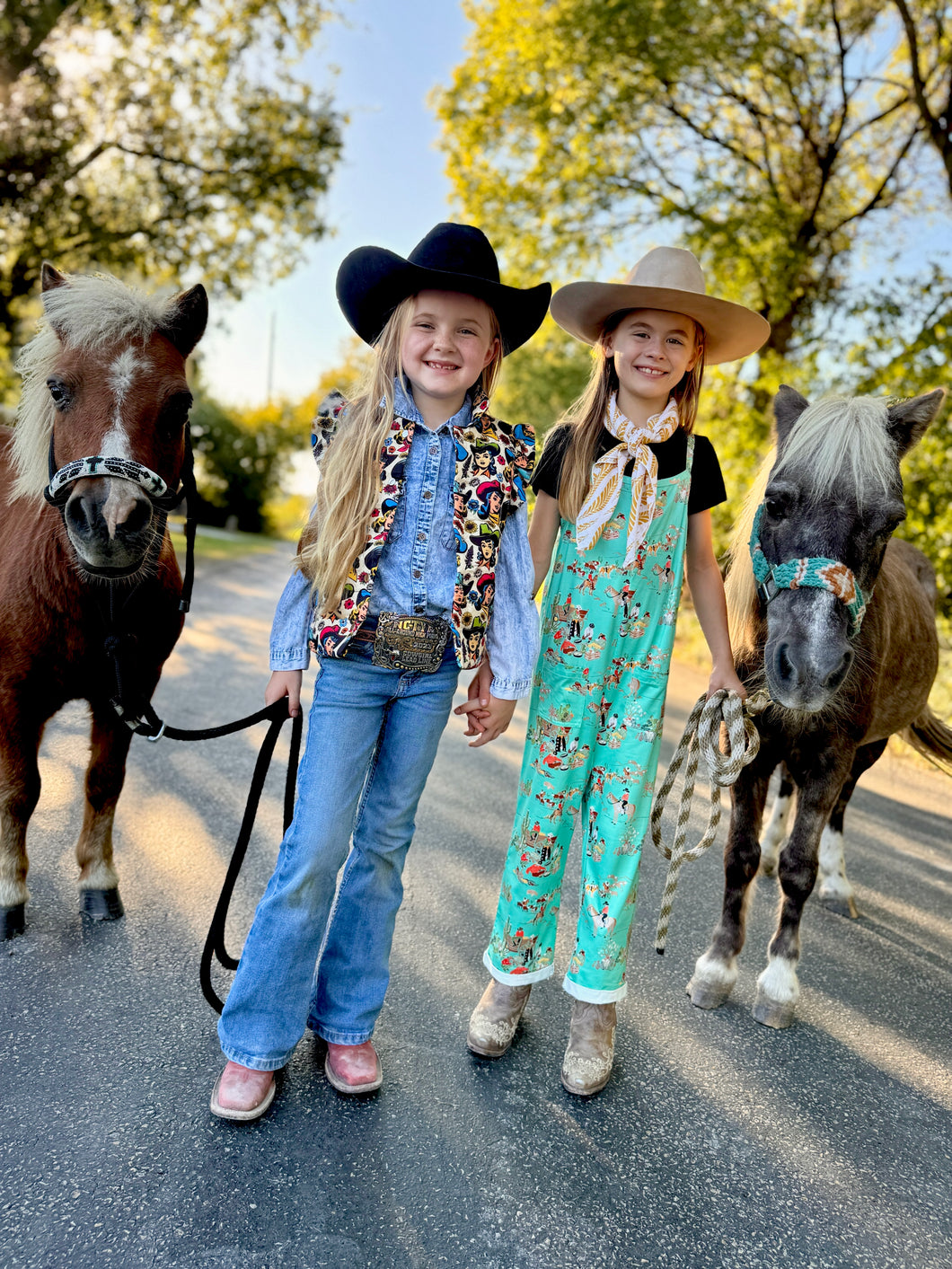 Get ready for some wild west fun with The Little turquoise wagon jumper! This playful jumpsuit features adjustable straps and front pockets, perfect for storing little treasures. The fun colorful western print adds a bold touch to this relaxed baggy style fit. Fashion for the little girls who are ready to saddle up and adventure!