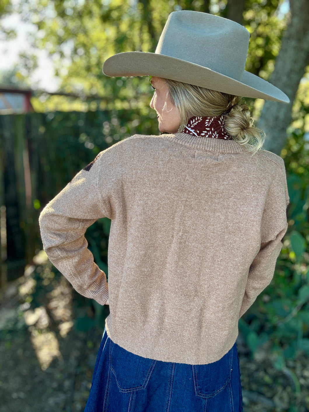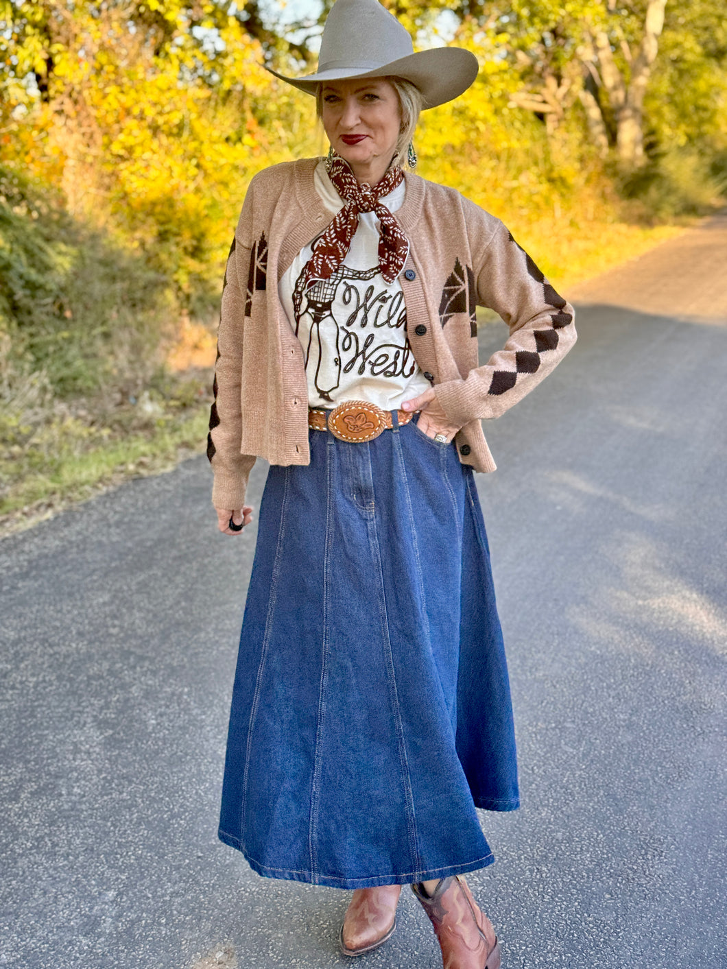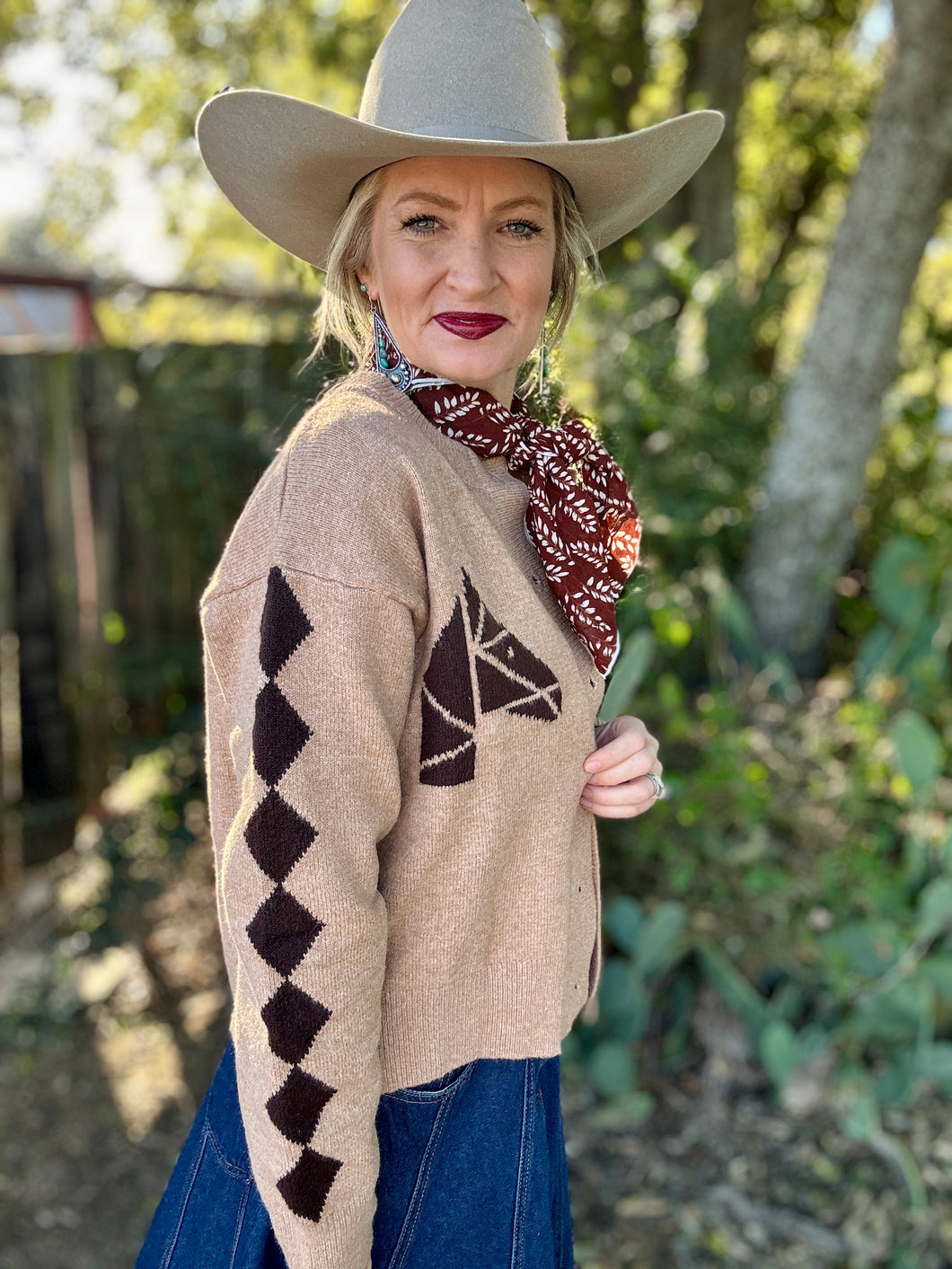 Wrangle up some serious style with The Checkmate cardigan—a classic button-up that pays homage to the spirit of the West. Horse heads on the front, with diamonds line the sleeves like stars across a desert sky. Light as a feather and built for all-day wear, this cardigan is your trusty companion for looking sharp whether you're hitting the ranch or the town.
