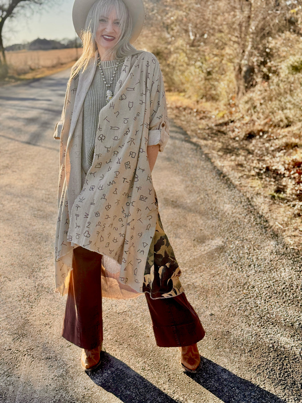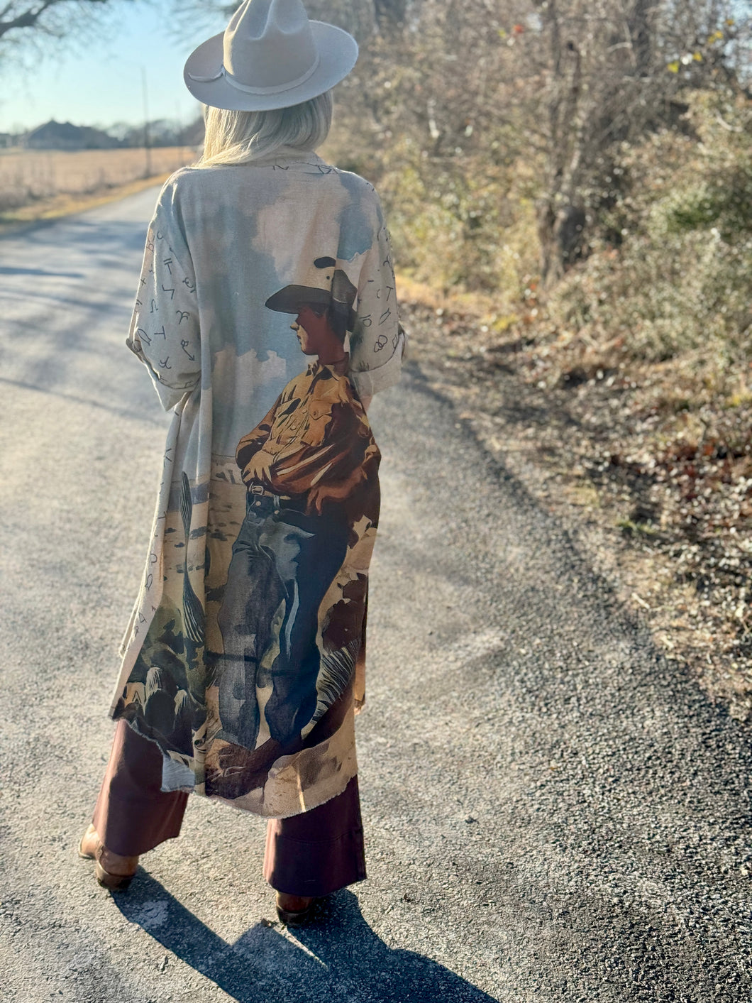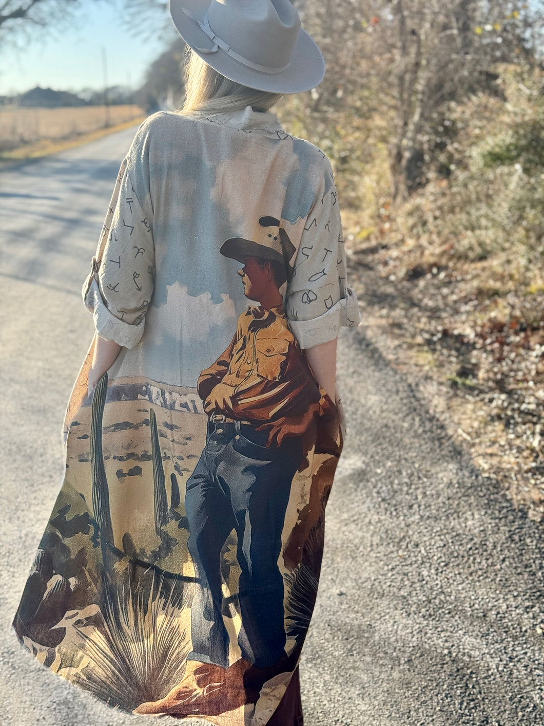 Channel your inner cowgirl with The Dingo duster—a playful take on Western style that's equal parts practical and fun. Crafted from a soft cotton-linen blend, this hi-lo duster features a bold Western cowboy design on the back and branded Western print on the front. Roll up the sleeves for a casual vibe or let them flow for full dramatic effect. Hip pockets keep your essentials close while you saddle up for whatever adventure comes your way. Perfect for layering over your favorite tees or dresses, this duster brings authentic Western flair with a modern twist.
