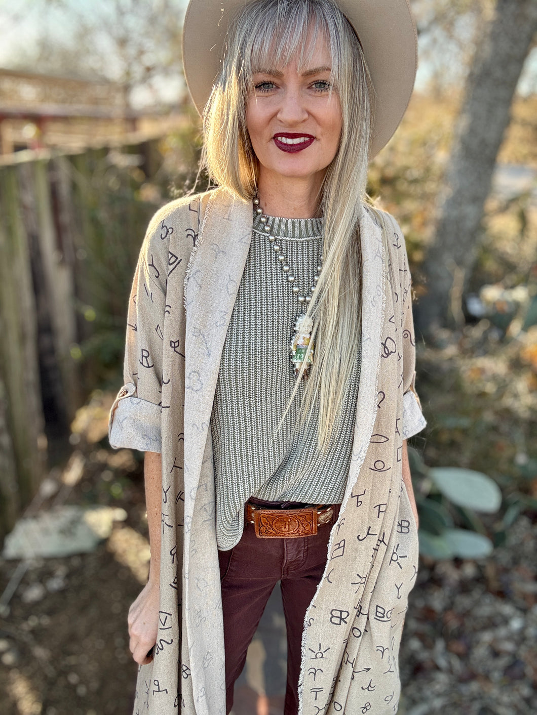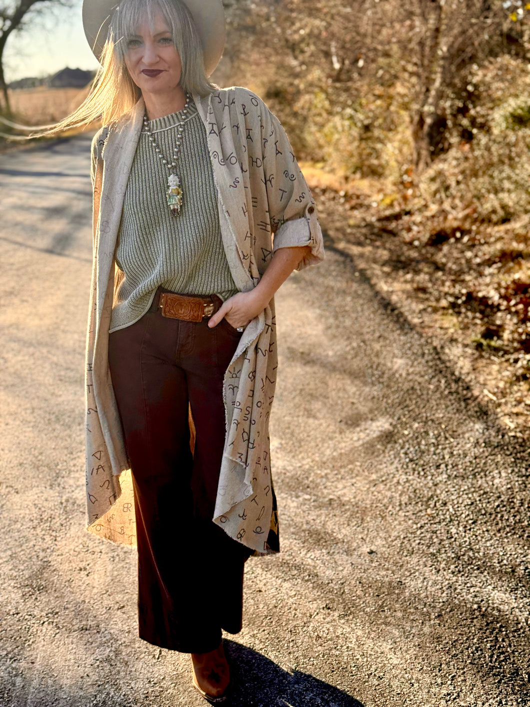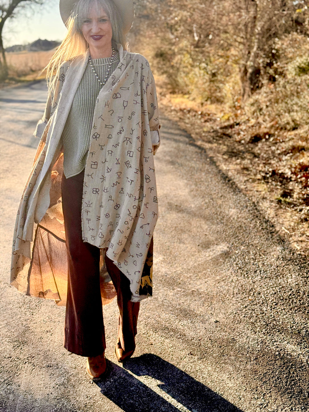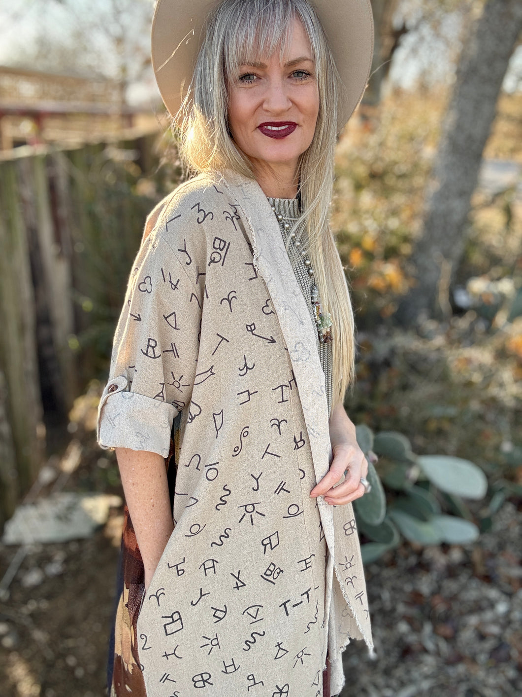 Channel your inner cowgirl with The Dingo duster—a playful take on Western style that's equal parts practical and fun. Crafted from a soft cotton-linen blend, this hi-lo duster features a bold Western cowboy design on the back and branded Western print on the front. Roll up the sleeves for a casual vibe or let them flow for full dramatic effect. Hip pockets keep your essentials close while you saddle up for whatever adventure comes your way. Perfect for layering over your favorite tees or dresses, this duster brings authentic Western flair with a modern twist.