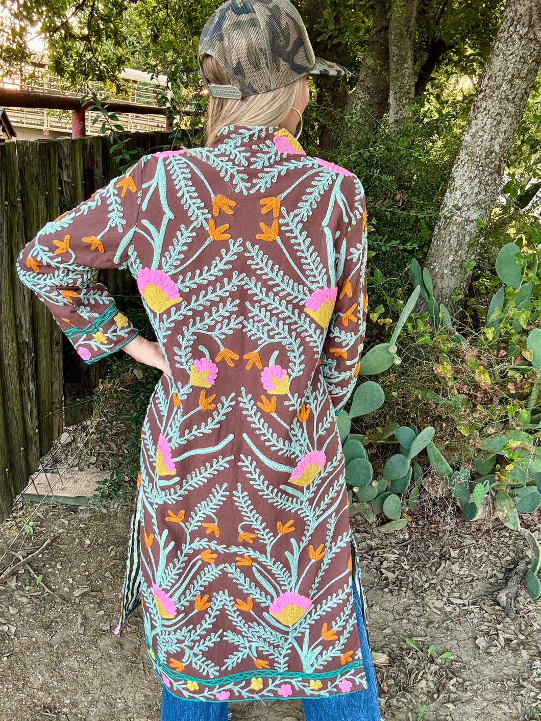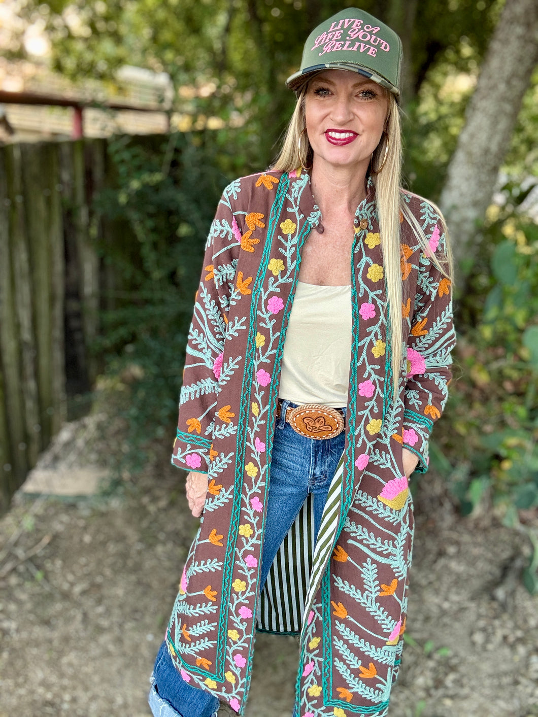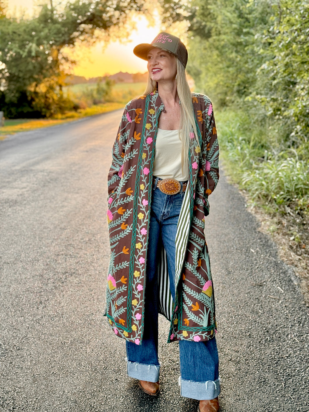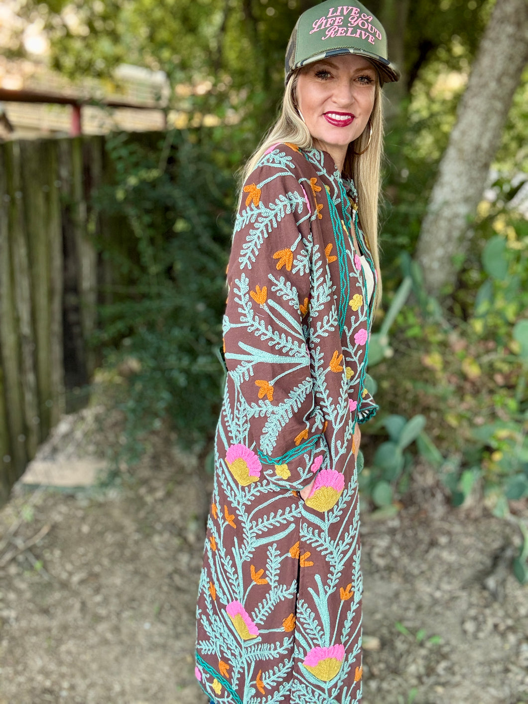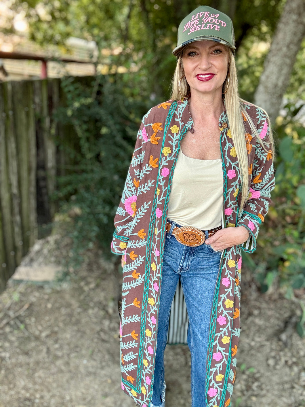 The Dixie Duster is a one-of-a-kind statement piece featuring beautiful, bold embroidery and vibrant colors that turn heads. Designed with convenient pockets and stylish side slits, this duster jacket pairs effortlessly with any outfit for a playful, standout look. Only one available—grab this unique find before it’s gone!