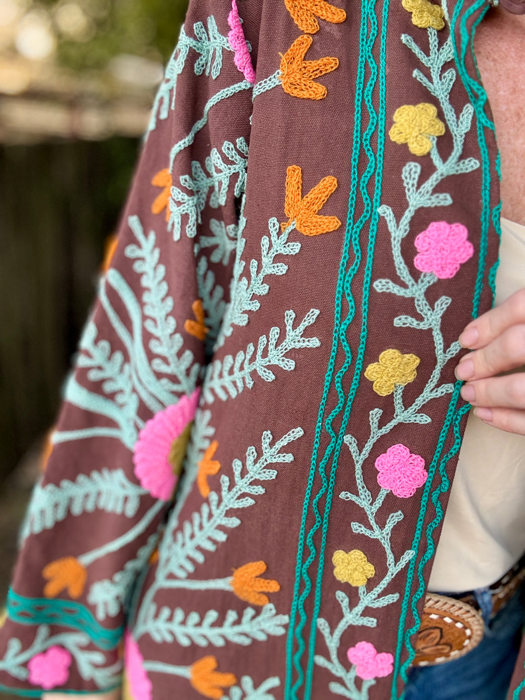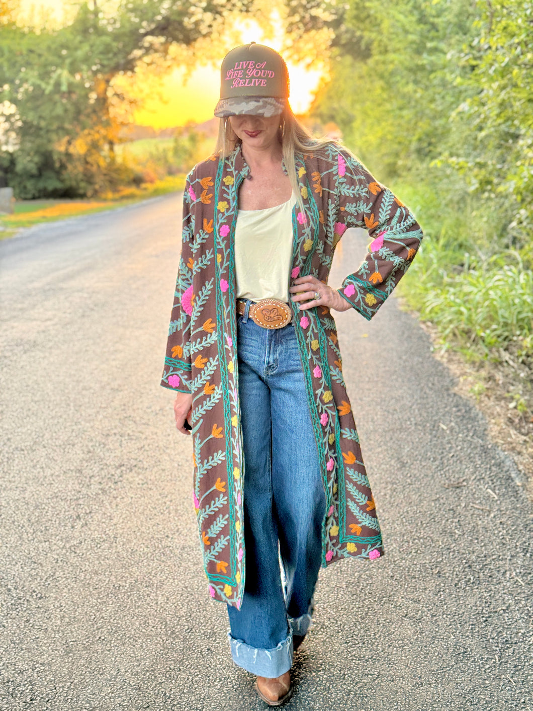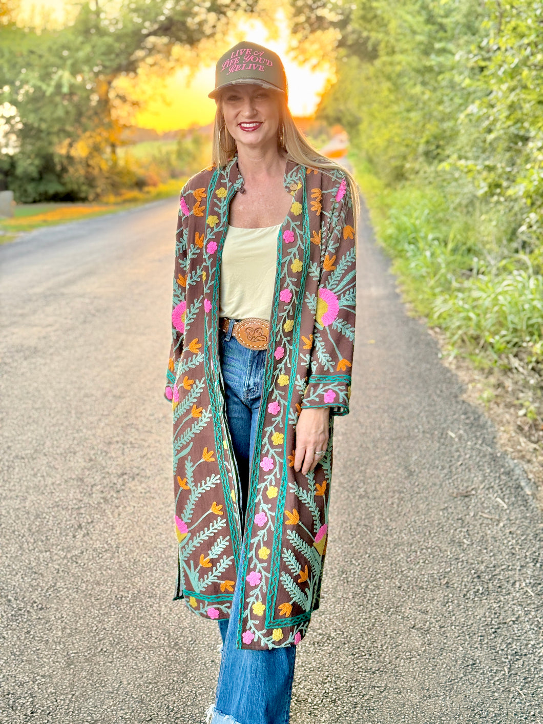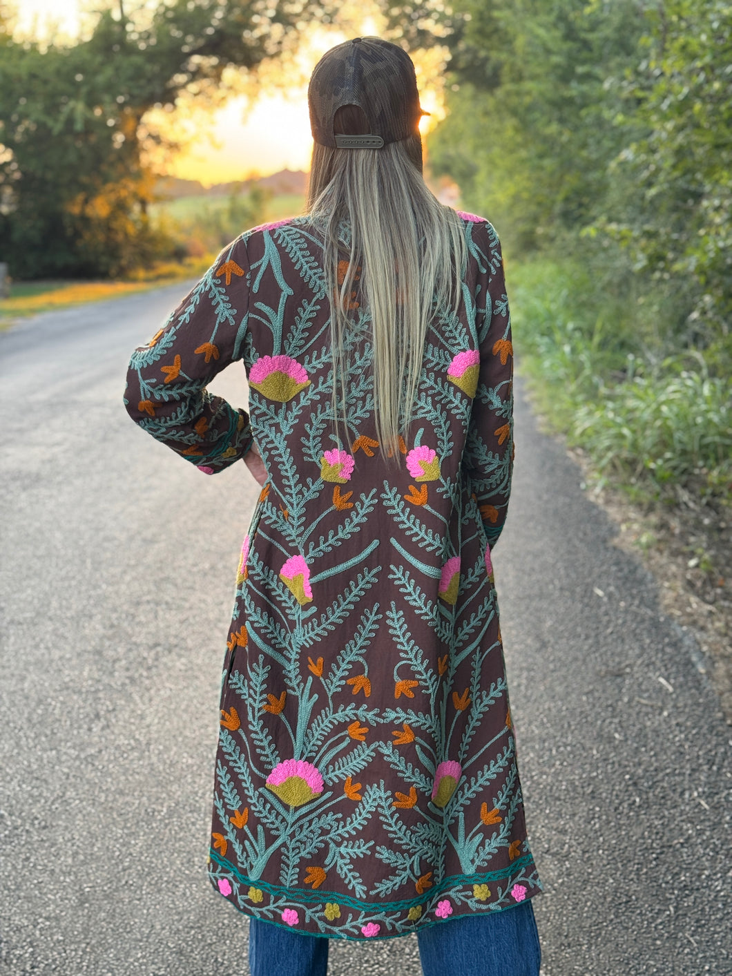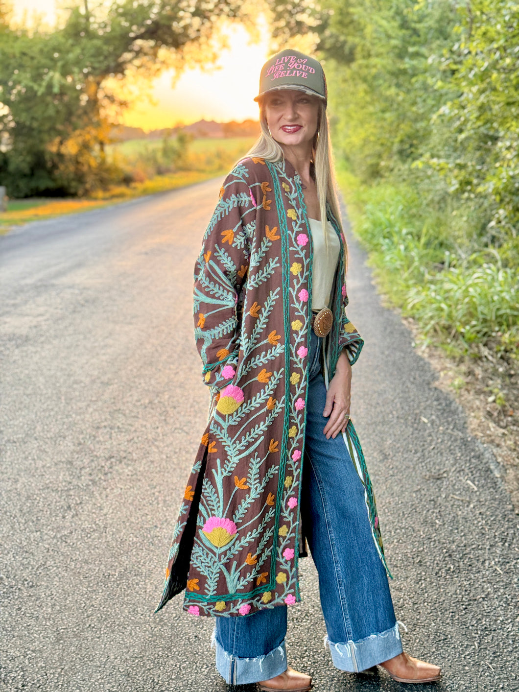 The Dixie Duster is a one-of-a-kind statement piece featuring beautiful, bold embroidery and vibrant colors that turn heads. Designed with convenient pockets and stylish side slits, this duster jacket pairs effortlessly with any outfit for a playful, standout look. Only one available—grab this unique find before it’s gone!