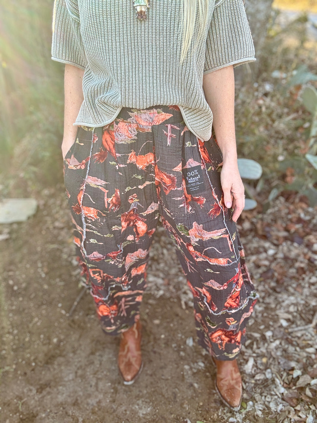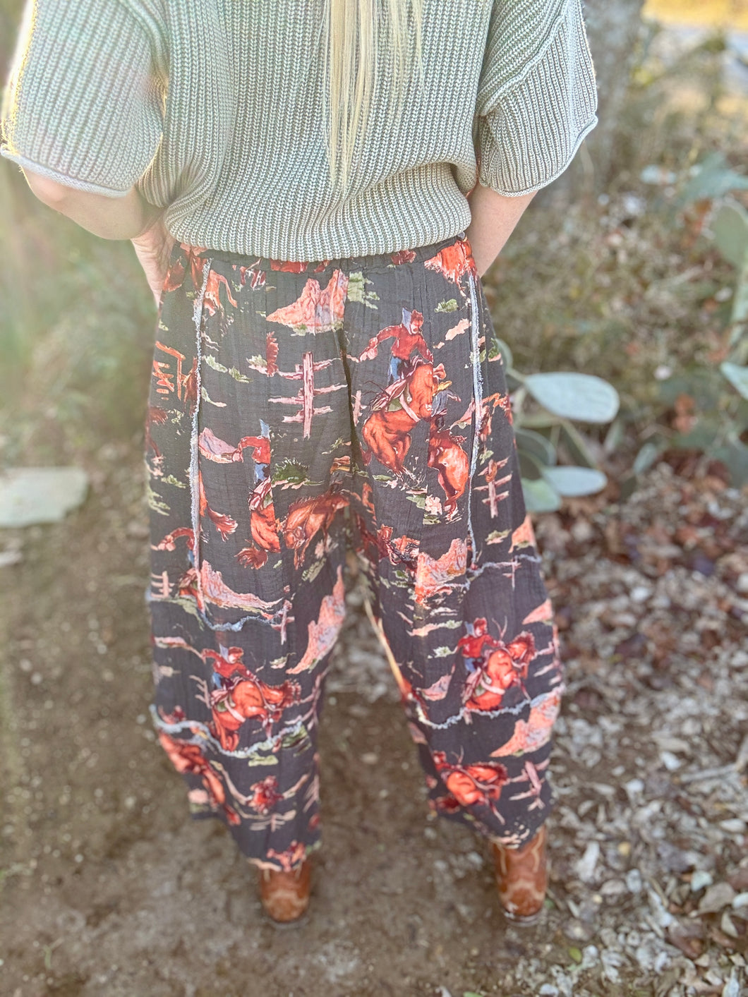 Slide into The Howdy harem pants—your new best buddy for lounging and roaming! With a relaxed fit, elastic waist, and pockets (because who doesn’t love pockets?), these lightweight, gauzy beauties will have you feeling as free as a tumbleweed in a breeze. Available in two snazzy colors, get ready to rustle up some style!