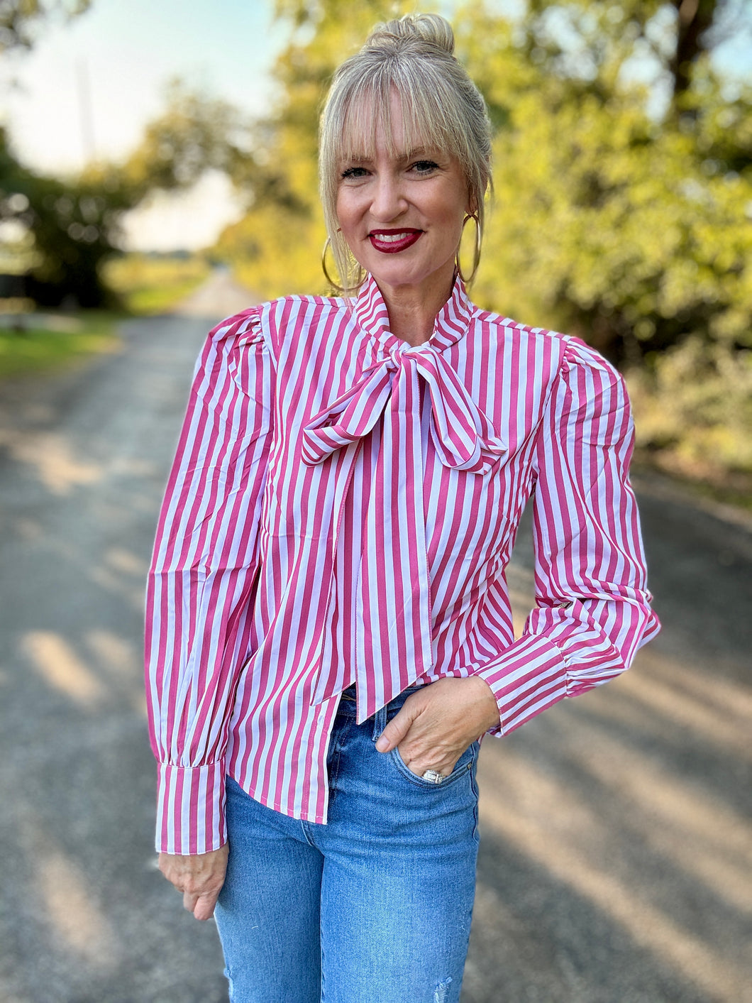 Strut your stuff in this playful button-up blouse featuring bold red and white stripes that scream vintage charm. The front tie bow detail adds a flirty twist that's perfect for dressing up or down. Whether you're channeling retro vibes or just want to turn heads, this striped stunner delivers personality with every wear. A wardrobe essential that's anything but boring. So perfect for layering for the holiday season!!