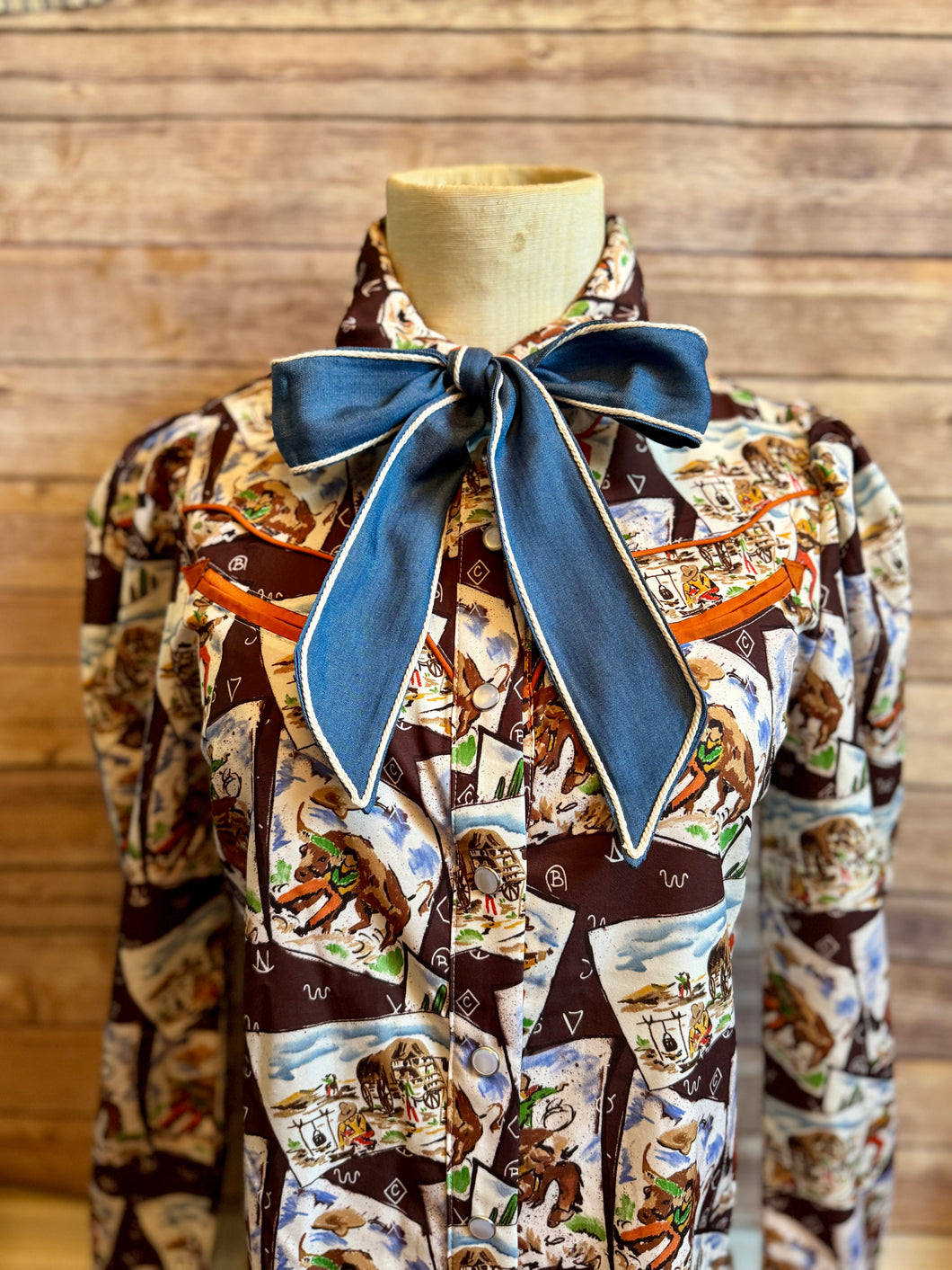 Elevate your style with The Denim Trail knot twilly. Made with denim and white piping, this long neck scarf adds a touch of sophistication to any outfit. Perfect for adding a pop of color and texture, it's a must-have for any fashion-forward individual.