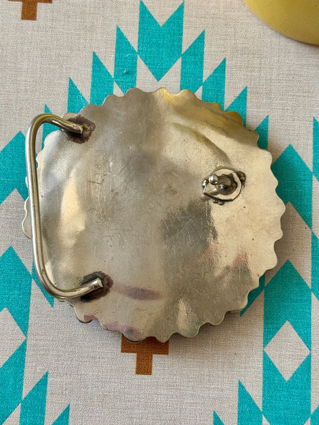 This striking German silver belt buckle features vibrant turquoise stones set in the center, surrounded by intricate silver flower trim detailing. The combination of cool turquoise and warm silver creates a captivating contrast that works beautifully with both casual and dressed-up looks. Perfect for adding a touch of southwestern flair or bohemian elegance to any outfit, this buckle is a standout accessory that showcases quality craftsmanship and timeless style.