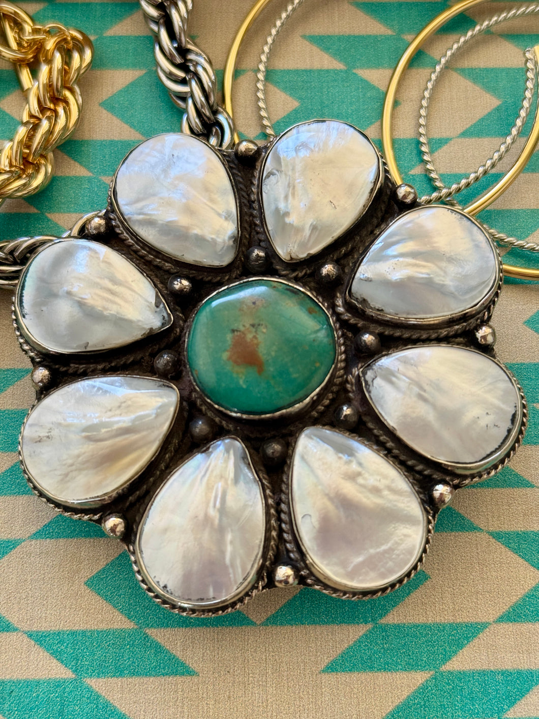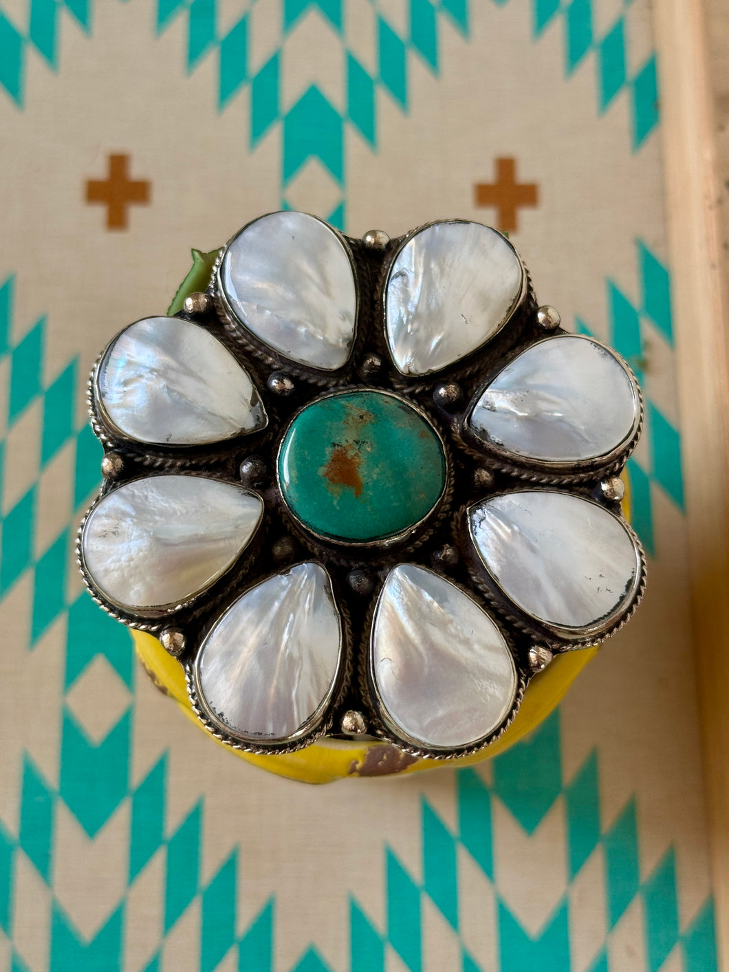 This charming daisy-shaped belt buckle combines the timeless elegance of fresh water pearl petals and vibrant genuine turquoise center. Crafted from durable German silver with intricate silver scrollwork adorning the back, it's a statement piece that blends natural beauty with artisan craftsmanship. Perfect for adding a touch of bohemian flair to any outfit, this buckle transforms an everyday accessory into wearable art.