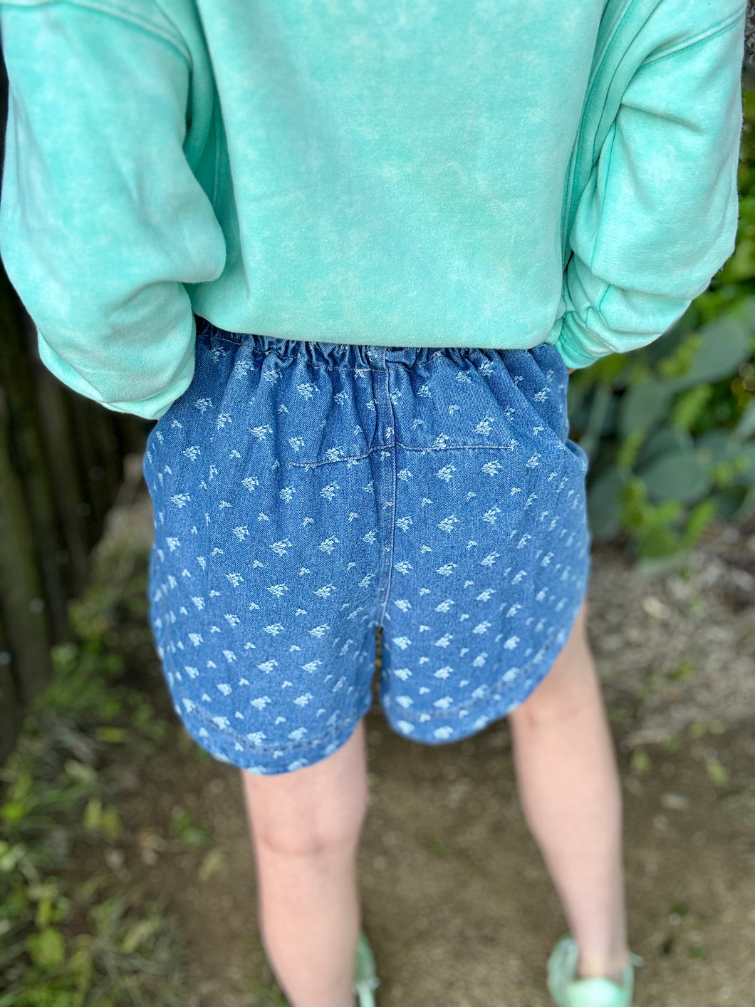 These oversized denim shorts feature delicate white flowers scattered across the denim fabric. The signature balloon-style silhouette pairs perfectly with generously sized hip pockets—ideal for keeping essentials close while maintaining that relaxed, carefree vibe. Perfect for warm-weather adventures, casual outings, or laid-back days at home. These shorts have an elastic waist and drawstring front tie