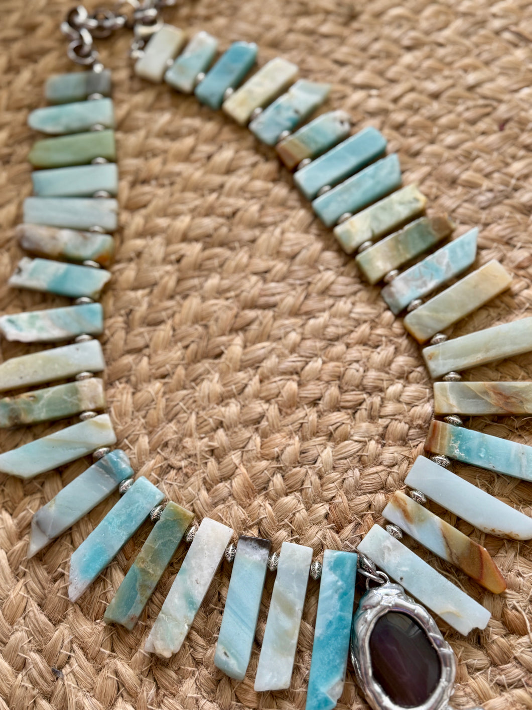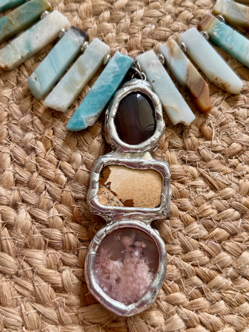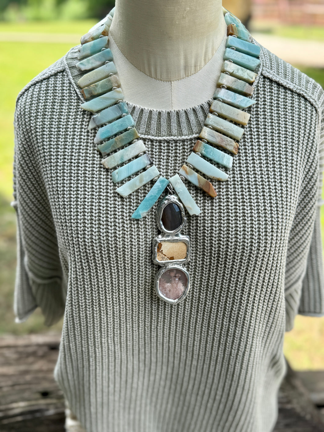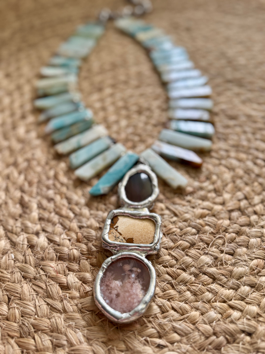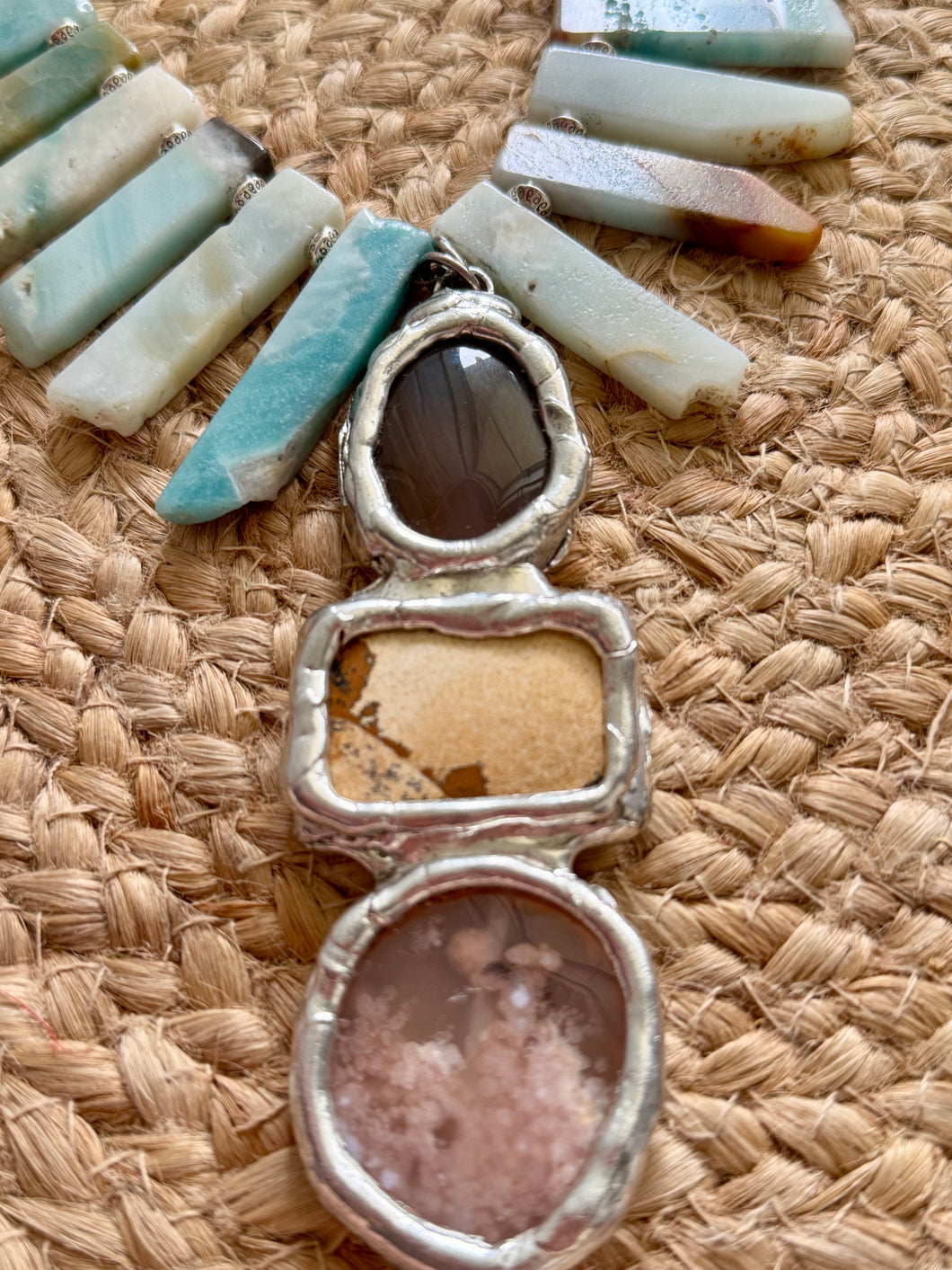 The Bibsy necklace is a striking handmade statement piece featuring natural stones arranged in a bold bib style. The necklace showcases the unique character of genuine stones, with their organic colors and textures creating an eye-catching focal point. Perfect for elevating everyday looks or adding drama to special occasions, this artisan-crafted design brings earthy elegance and timeless appeal to any wardrobe. This is a more substantial statement necklace, made to make a statement!
